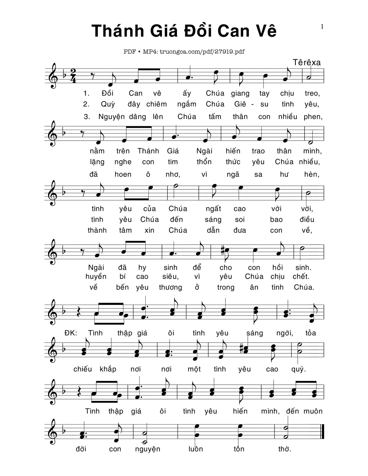Têrêsa Đồi Canvê ấy Chúa giang tay chịu treo Nằm trên Thánh Giá [PDF] [Sheet] [Lời H.A] [Mp4/Midi]