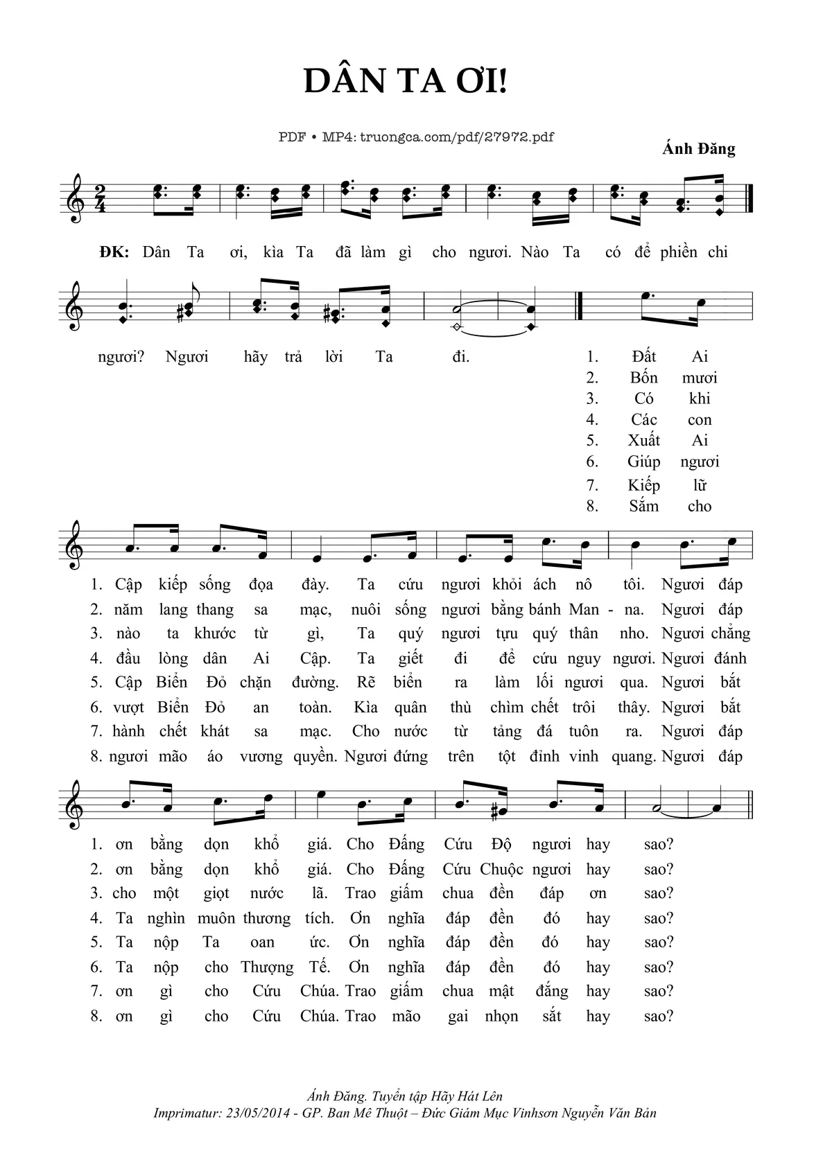 Điệp khúc: Dân ta ơi, kìa Ta đã làm gì cho ngươi. Nào Ta có để phiền chi ngươi? Ngươi hãy trả lời Ta đi.