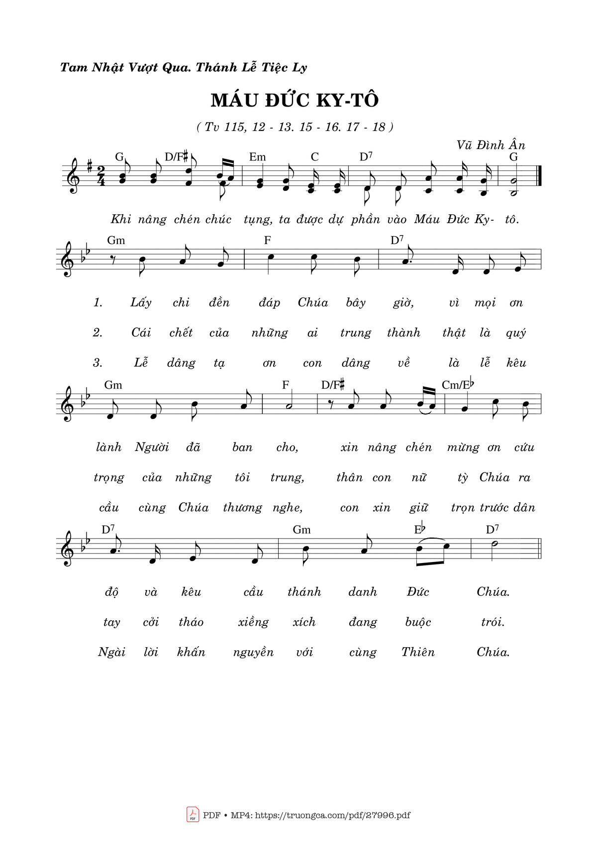Chọn nút dấu + để tăng tông lên nửa cung, nút dấu - để giảm tông xuống nửa cung. Rê chuột vào hợp âm để xem các thế bấm hợp âm của bài hát Thánh Vịnh 115, Máu Đức Kitô.