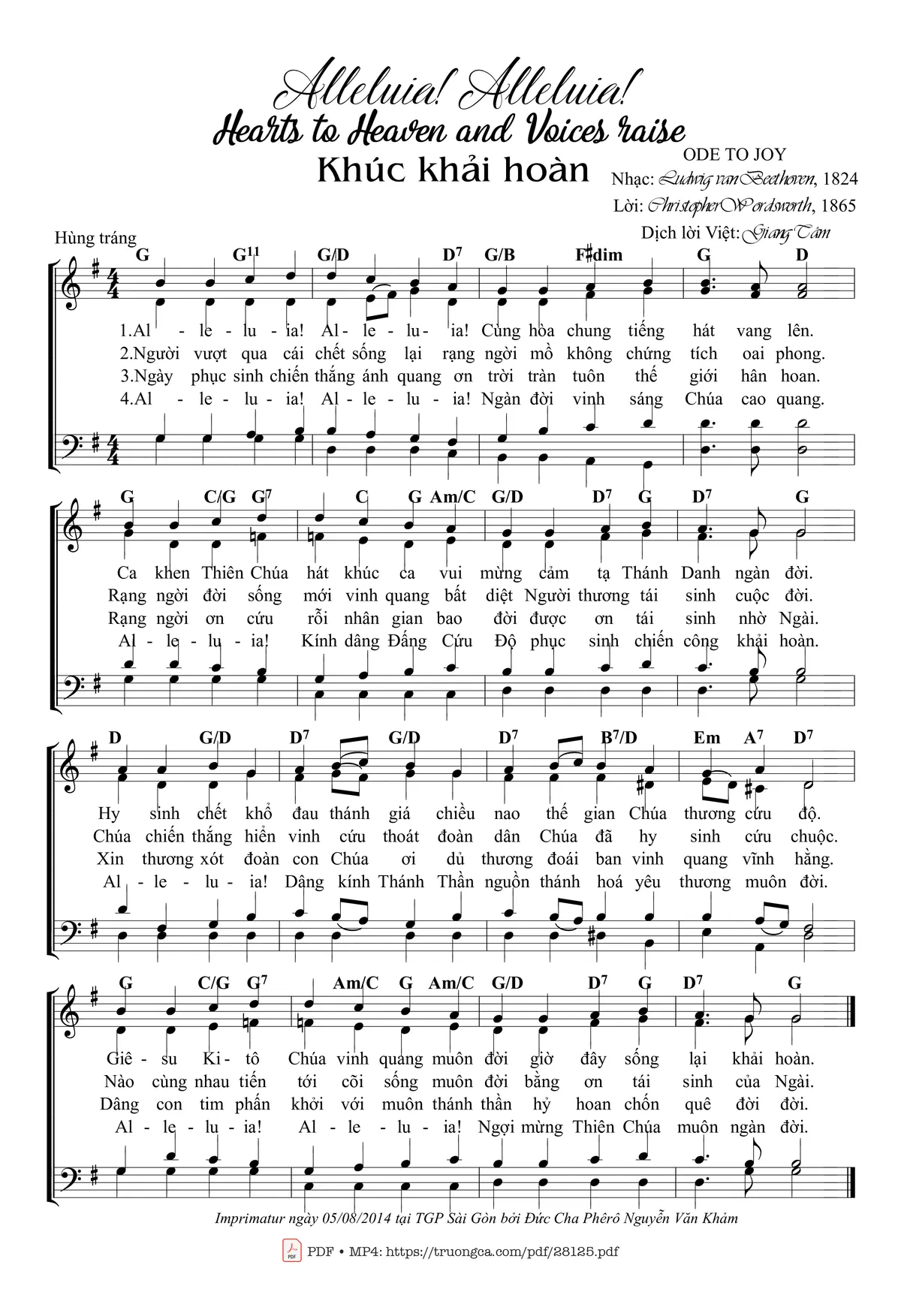 4. Al-lê-lu-ia! Al-lê-lu-ia! Ngàn đời vinh sáng Chúa cao quang. Al-lê-lu-ia! Kính dâng Đấng Cứu Độ phục sinh chiến công khải hoàn. Al-lê-lu-ia! Dâng kính Thánh Thần nguồn thánh hoá yêu thương muôn đời. Al-lê-lu-ia! Al-lê-lu-ia! Ngợi mừng Thiên Chúa muôn ngàn đời.