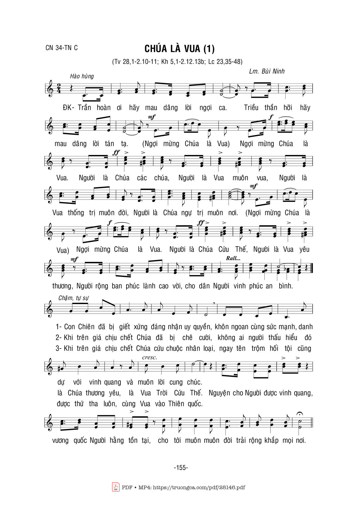 Điệp khúc. Trần hoàn ơi hãy mau dâng lời ngợi ca. Triều thần hỡi hãy mau dâng lời tán tạ. (Ngợi mừng Chúa là Vua) Ngợi mừng Chúa là Vua. Người là Chúa các chúa, Người là Vua muôn vua, Người là Vua thống trị muôn đời, Người là Chúa ngự trị muôn nơi. (Ngợi mừng Chúa là Vua) Ngợi mừng Chúa là Vua. Người là Chúa Cứu Thế, Người là Vua yêu thương, Người rộng ban phúc lành cao vời, cho dân Người vinh phúc an bình.