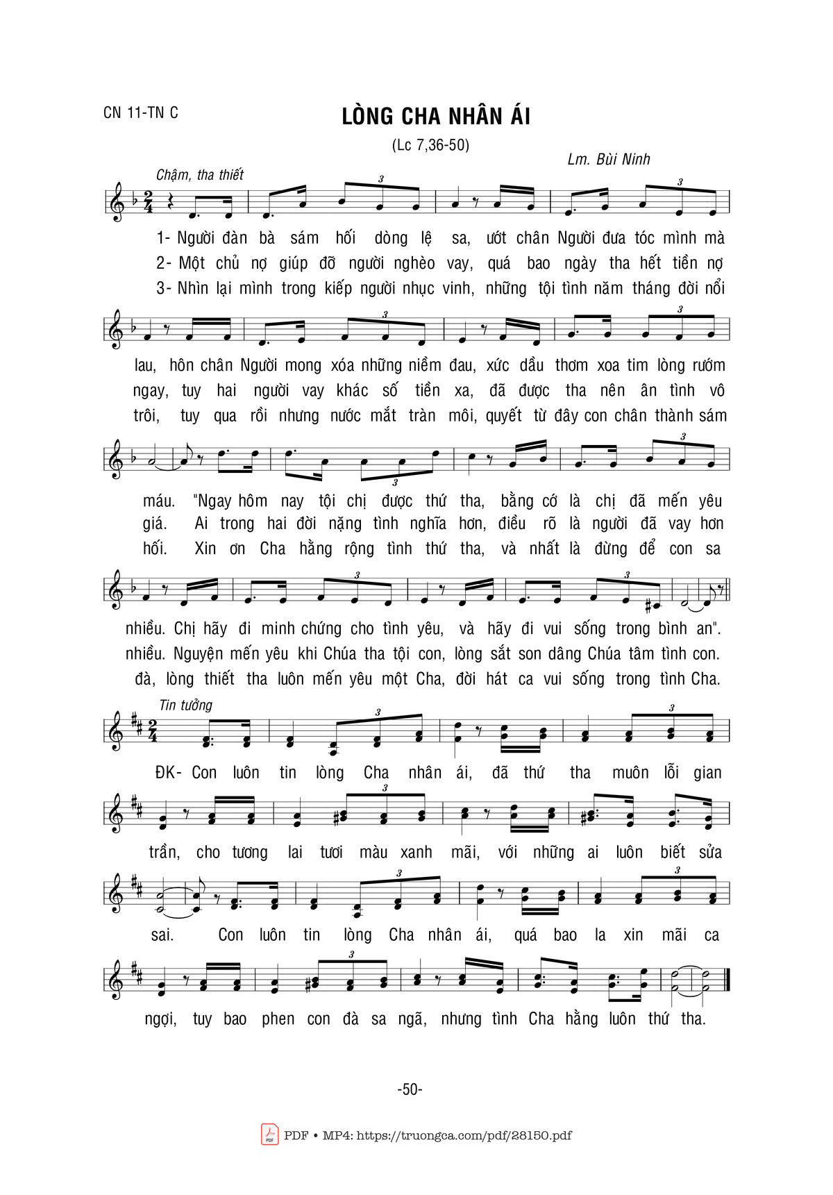 2- Một chủ nợ giúp đỡ người nghèo vay, quá bao ngày tha hết tiền nợ ngay, tuy hai người vay khác số tiền xa, đã được tha nên ân tình vô giá. Ai trong hai đời nặng tình nghĩa hơn, điều rõ là người đã vay hơn nhiều. Nguyện mến yêu khi Chúa tha tội con, lòng sắt son dâng Chúa tâm tình con.