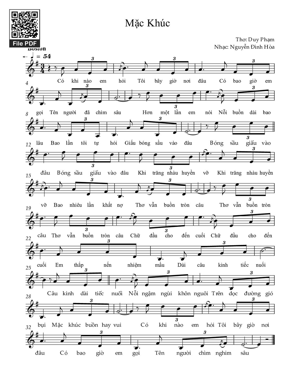 Phần nghe hát Mặc khúc (Nguyễn Đình Hòa) được nhúng từ Youtube, Musescore hoặc link ngoài và chịu sự kiểm soát bản quyền của bên thứ ba đó, vì vậy có thể bị xóa hoặc chèn quảng cáo bất kỳ lúc nào. Nếu bạn không nghe - xem được ca sĩ hát tức là đã bị Youtube hoặc Musescore kiểm soát.