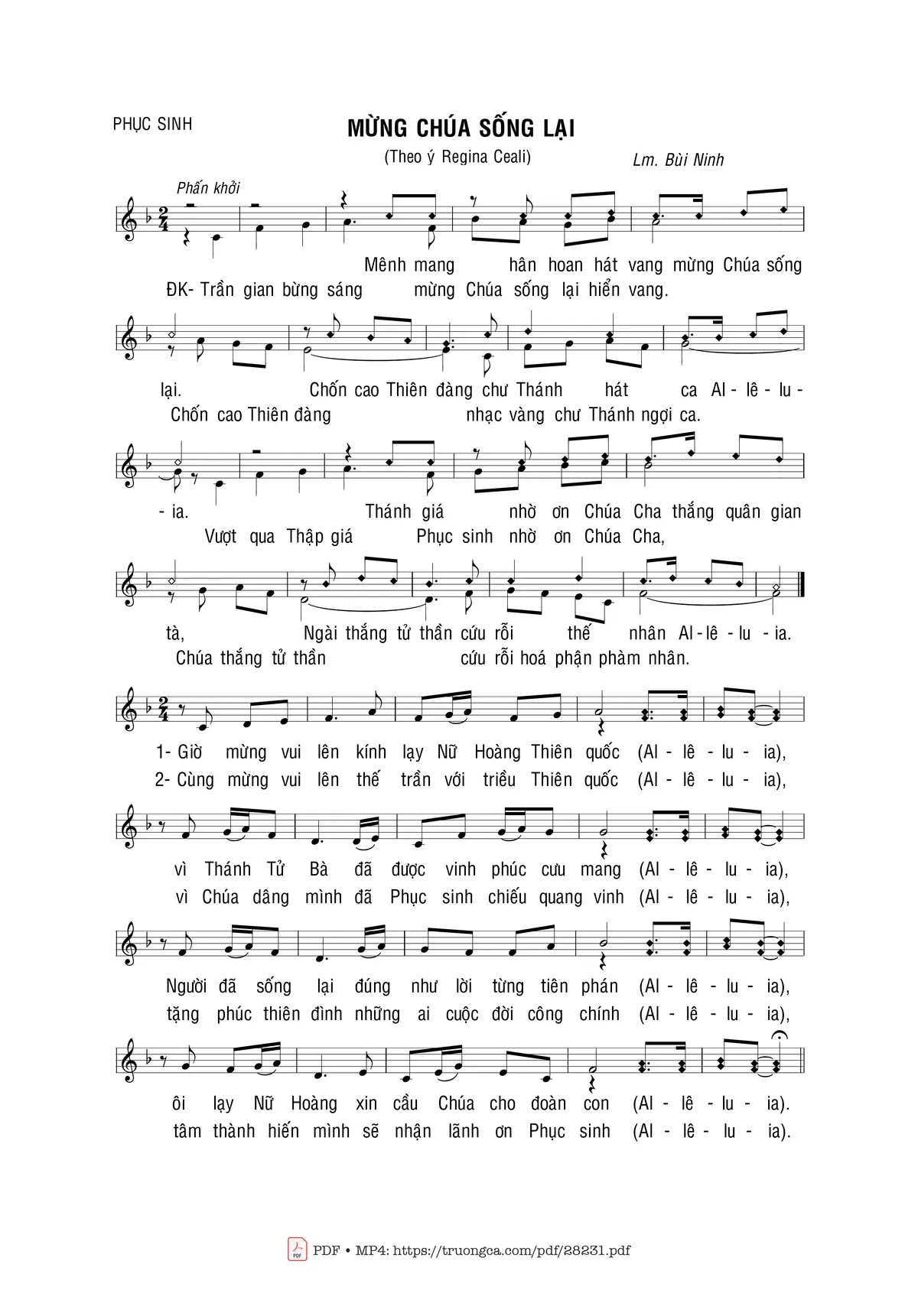 1- Giờ mừng vui lên kính lạy Nữ Hoàng Thiên quốc (Al-le-lu-ia!) vì Thánh Tử Bà đã được vinh phúc cưu mang (Al-le-lu-ia!) Người đã sống lại đúng như lời từng tiên phán (Al-le-lu-ia!) lạy Nữ Hoàng xin cầu Chúa cho đoàn con (Al-le-lu-ia!)