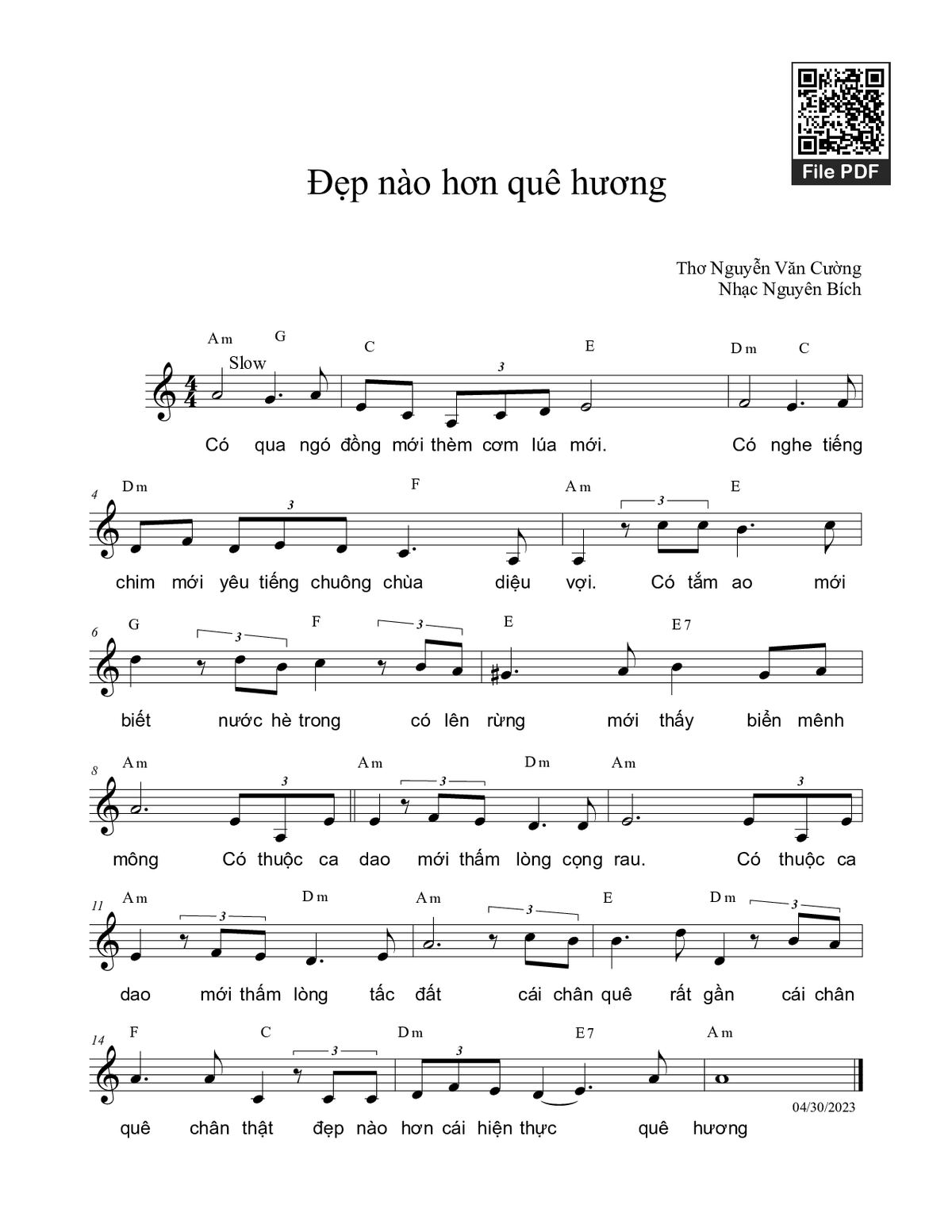 Nguyên Bích Có qua ngó đồng mới thèm cơm lúa mới Có nghe tiếng chim mới yêu tiếng chuông chùa diệu vợi [PDF] [Sheet] [Lời H.A] [Mp4/Midi]