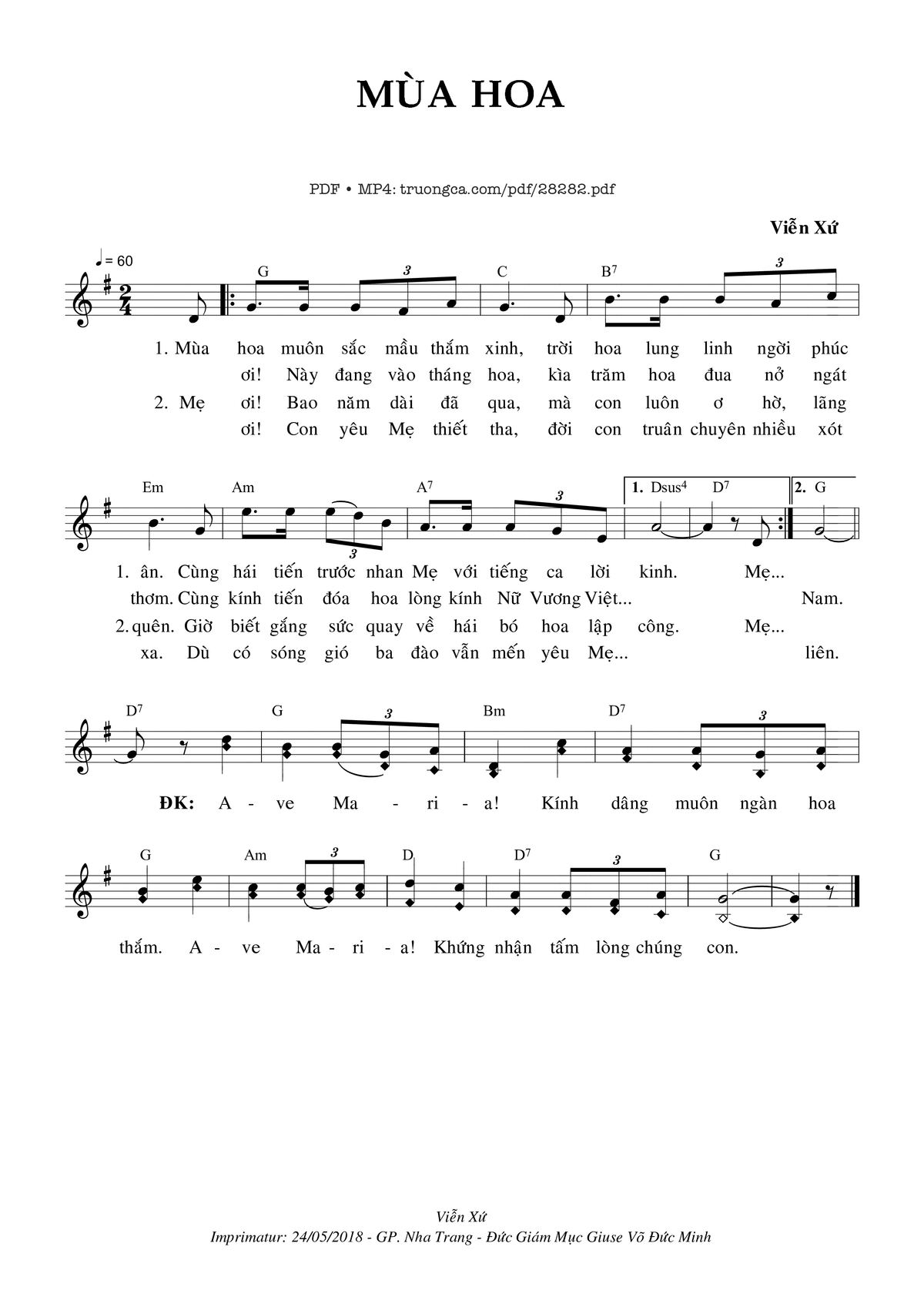 1) Mùa hoa muôn sắc mầu thắm xinh, trời hoa lung linh ngời phúc ân. Cùng hái tiến trước nhan Mẹ với tiếng ca lời kinh. Mẹ ơi! Này đang vào tháng hoa. Kìa trăm hoa đua nở ngát thơm. Cùng kính tiến đoá hoa lòng kính Nữ Vương Việt Nam.