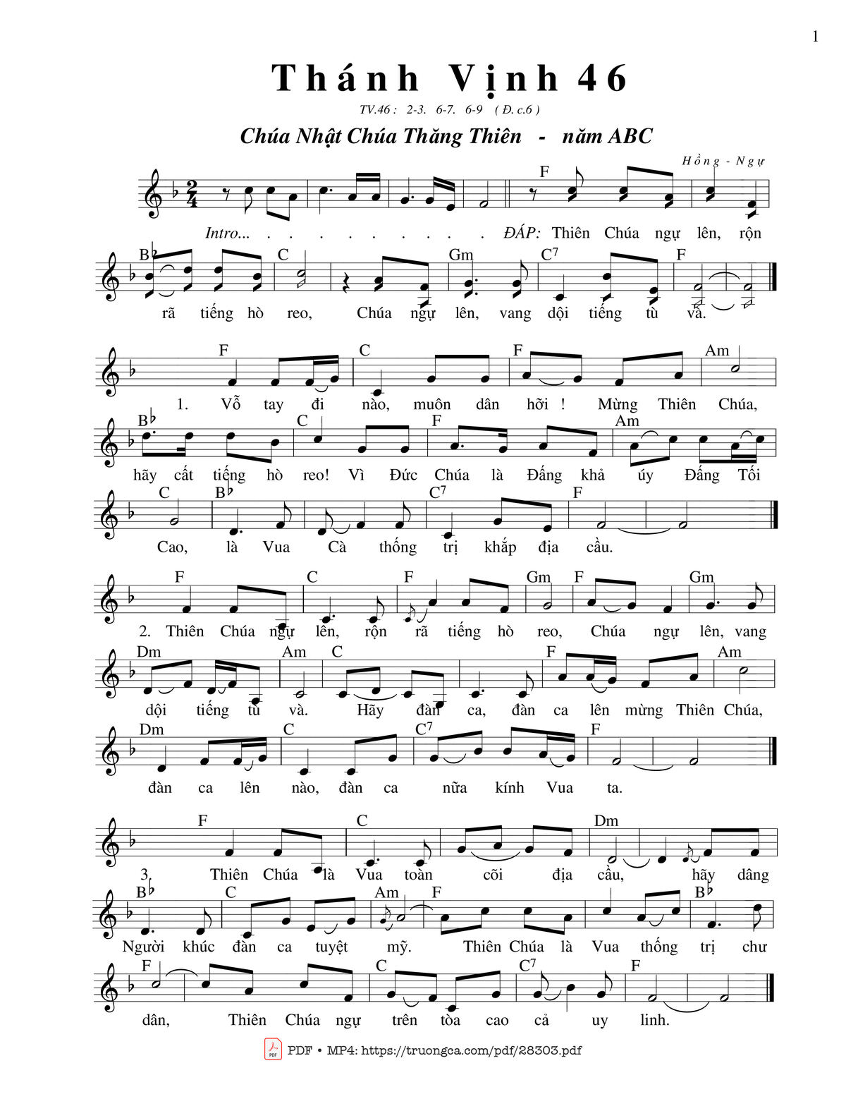 1. Vỗ tay đi nào, muôn dân hỡi! Mừng Thiên Chúa, hãy cất tiếng hò reo! Vì Đức Chúa là Đấng khả úy Đấng Tối Cao, là Vua Cả thống trị khắp địa cầu.
