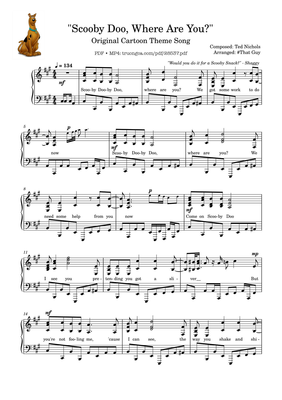 Phần đàn mẫu Scooby Doo, Where Are You? Piano (Composed: Ted Nichols) được nhúng từ Youtube, Musescore hoặc link ngoài và chịu sự kiểm soát bản quyền của bên thứ ba đó, vì vậy có thể bị xóa hoặc chèn quảng cáo bất kỳ lúc nào. Nếu bạn không nghe - xem được phần đàn mẫu hát mẫu tức là đã bị Youtube/Musescore kiểm soát.