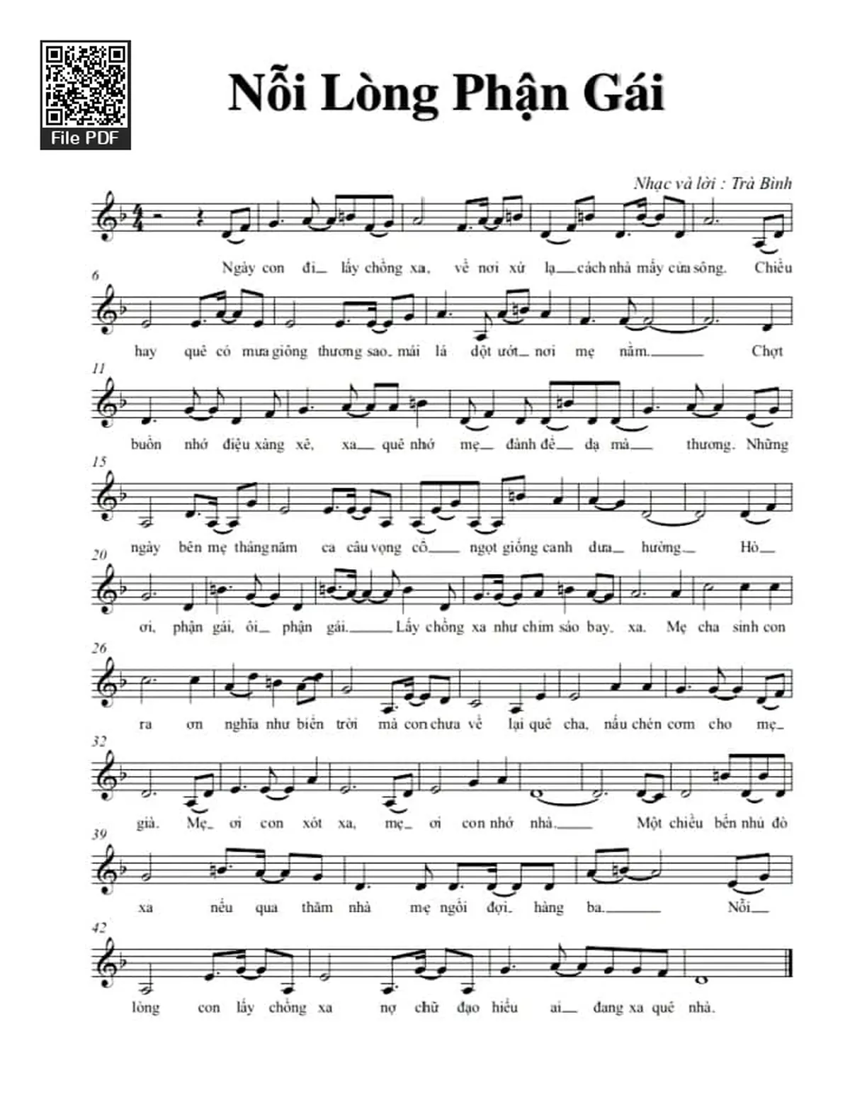 Trà Bình Ngày con đi lấy chồng xa Về nơi xứ lạ cách nhà mấy cửa sông [PDF] [Sheet] [Lời H.A] [Mp4/Midi]