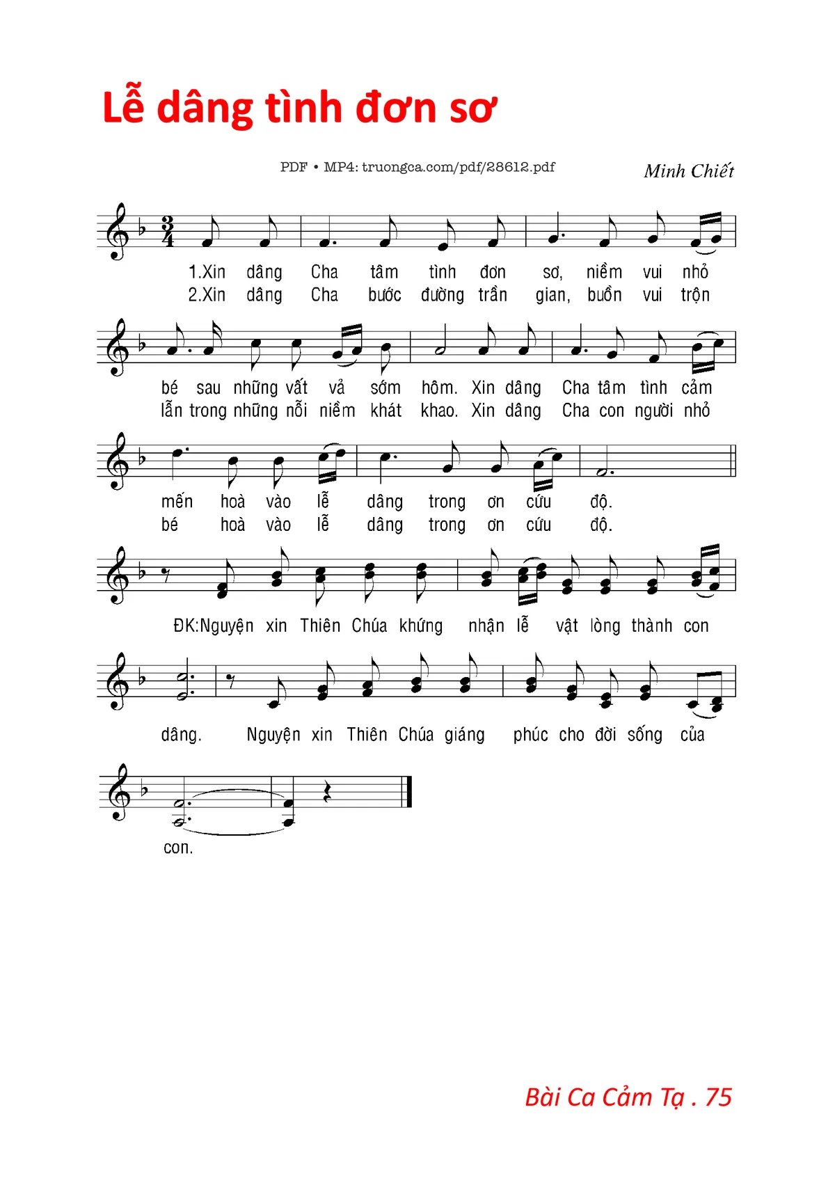 1. Xin dâng Cha tâm tình đơn sơ, niềm vui nhỏ bé sau những vất vả sớm hôm. Xin dâng Cha tâm tình cảm mến hòa vào lễ dâng trong ơn cứu độ.