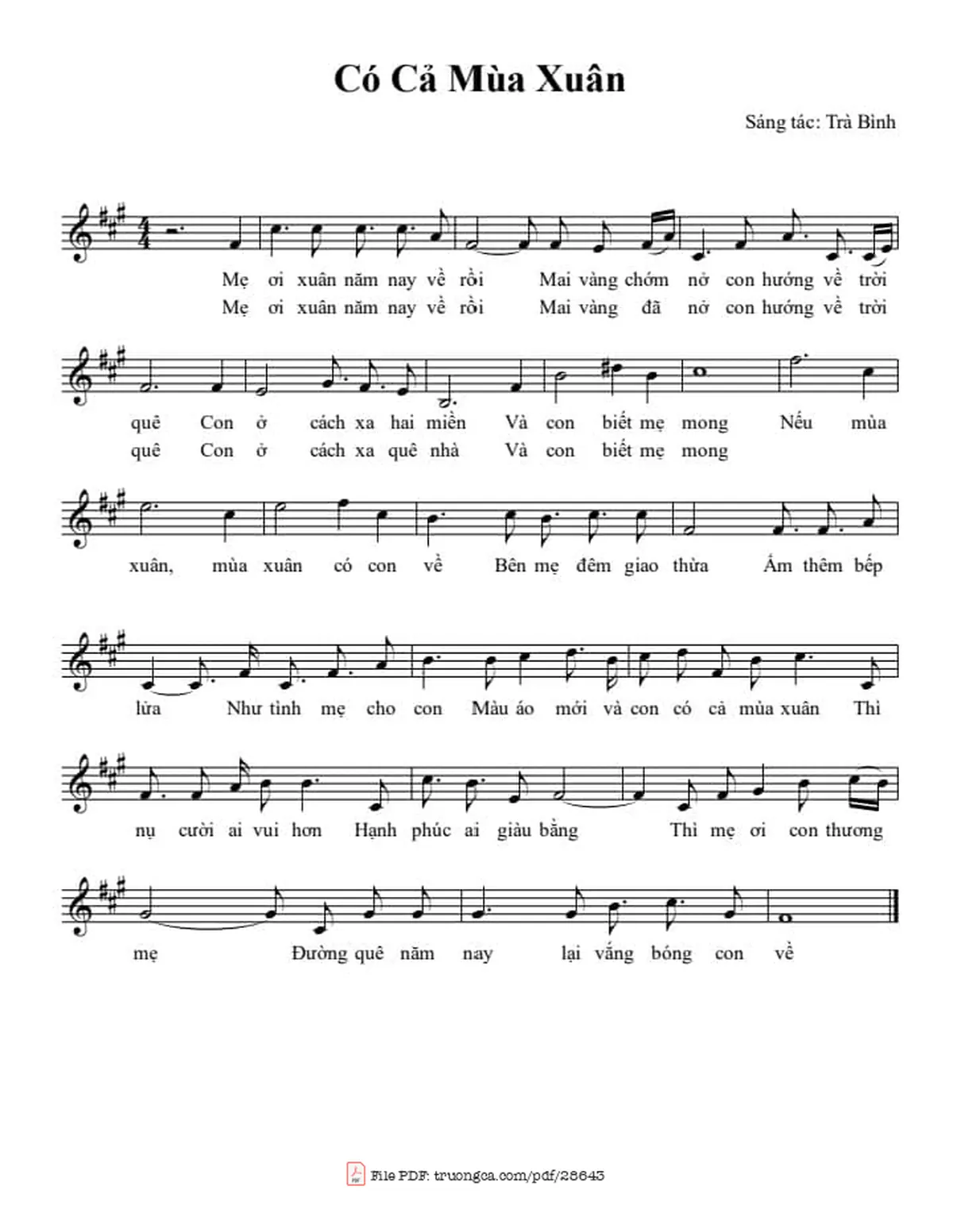 Trà Bình Mẹ ơi xuân năm nay về rồi Mai vàng chớm nở con hướng về trời quê [PDF] [Sheet] [Lời H.A] [Mp4/Midi]