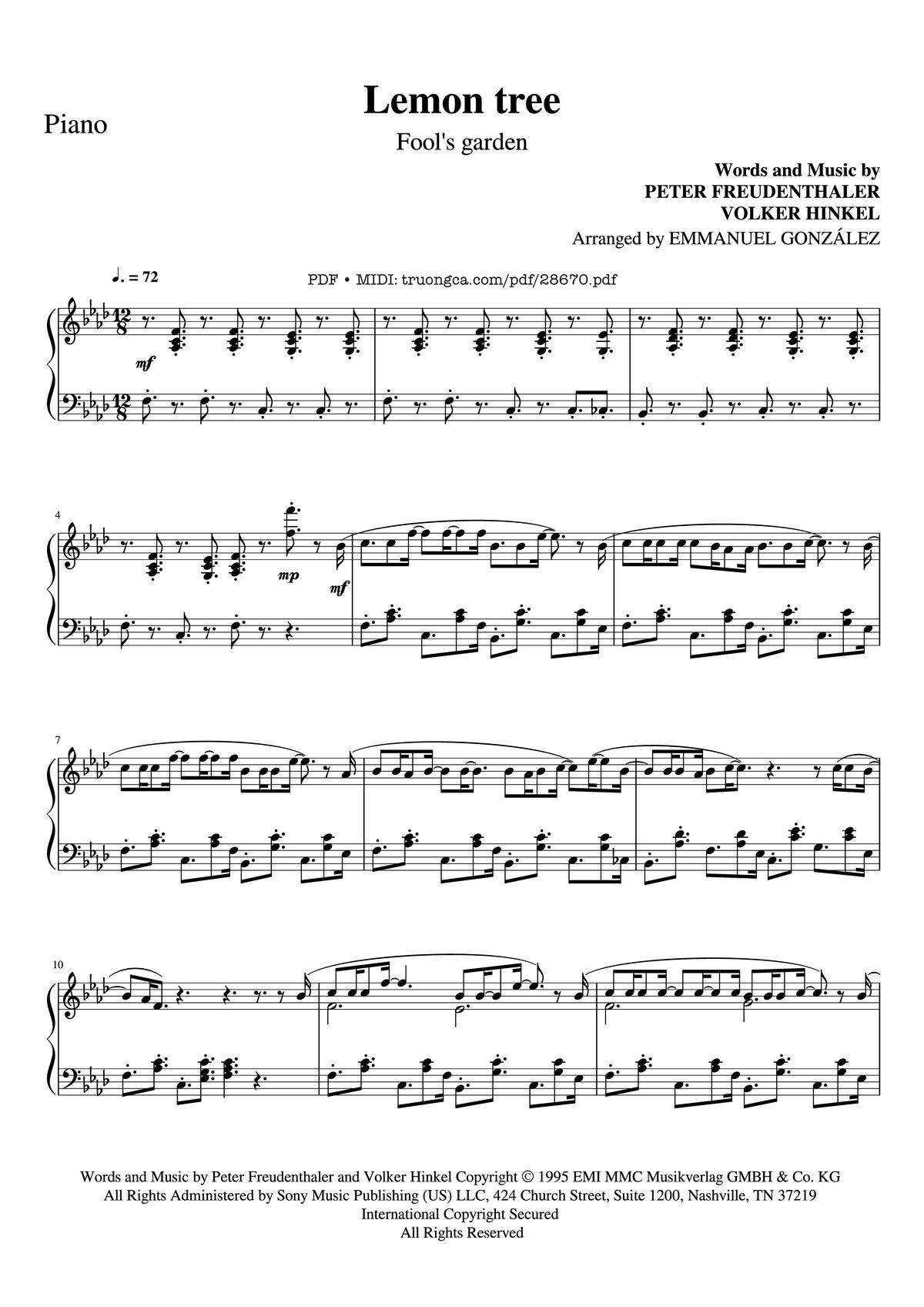 Download and print in PDF or MIDI free sheet music of lemon tree - Fool's Garden for Lemon Tree by Fool's Garden arranged by Piano Magno for Piano (Solo)