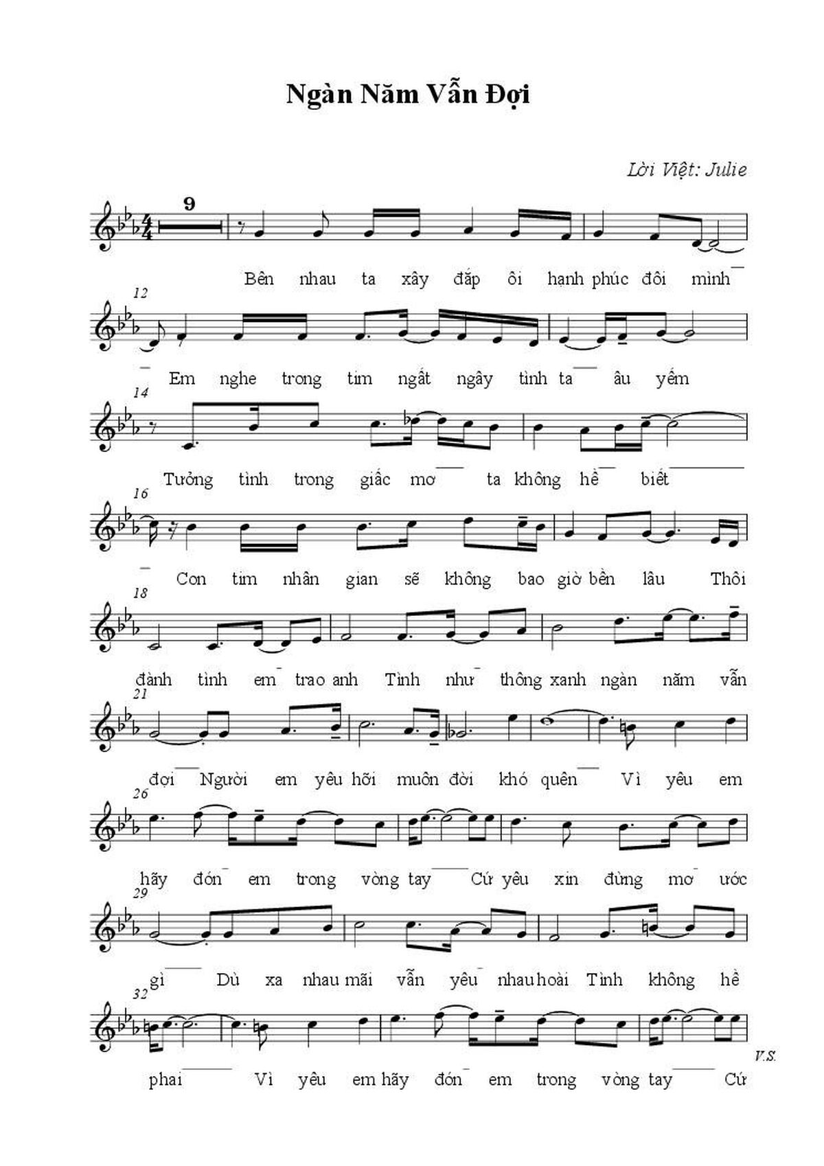 Sheet nhạc có nốt Ngàn Năm Vẫn Đợi của nhạc sĩ Khúc Lan và file PDF nốt nhạc đăng lên đây nhằm giúp các bạn xướng âm cho đúng nốt và hát thêm hay, chỉ mang tính chất tham khảo, không có mục đích thương mại. Bản quyền thuộc về tác giả và tổ chức nắm bản quyền, Truongca.com không giữ bất kỳ bản quyền của nội dung nào cả. Các bạn có thể tải về bản PDF chất lượng cao, gồm khuông nhạc có nốt với đường link file PDF bên trên.