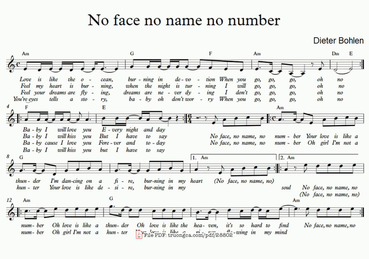 Phần nghe hát No Face No Name No Number (Dieter Bohlen) được nhúng từ Youtube, Musescore hoặc link ngoài và chịu sự kiểm soát bản quyền của bên thứ ba đó, vì vậy có thể bị xóa hoặc chèn quảng cáo bất kỳ lúc nào. Nếu bạn không nghe - xem được ca sĩ hát tức là đã bị Youtube hoặc Musescore kiểm soát.