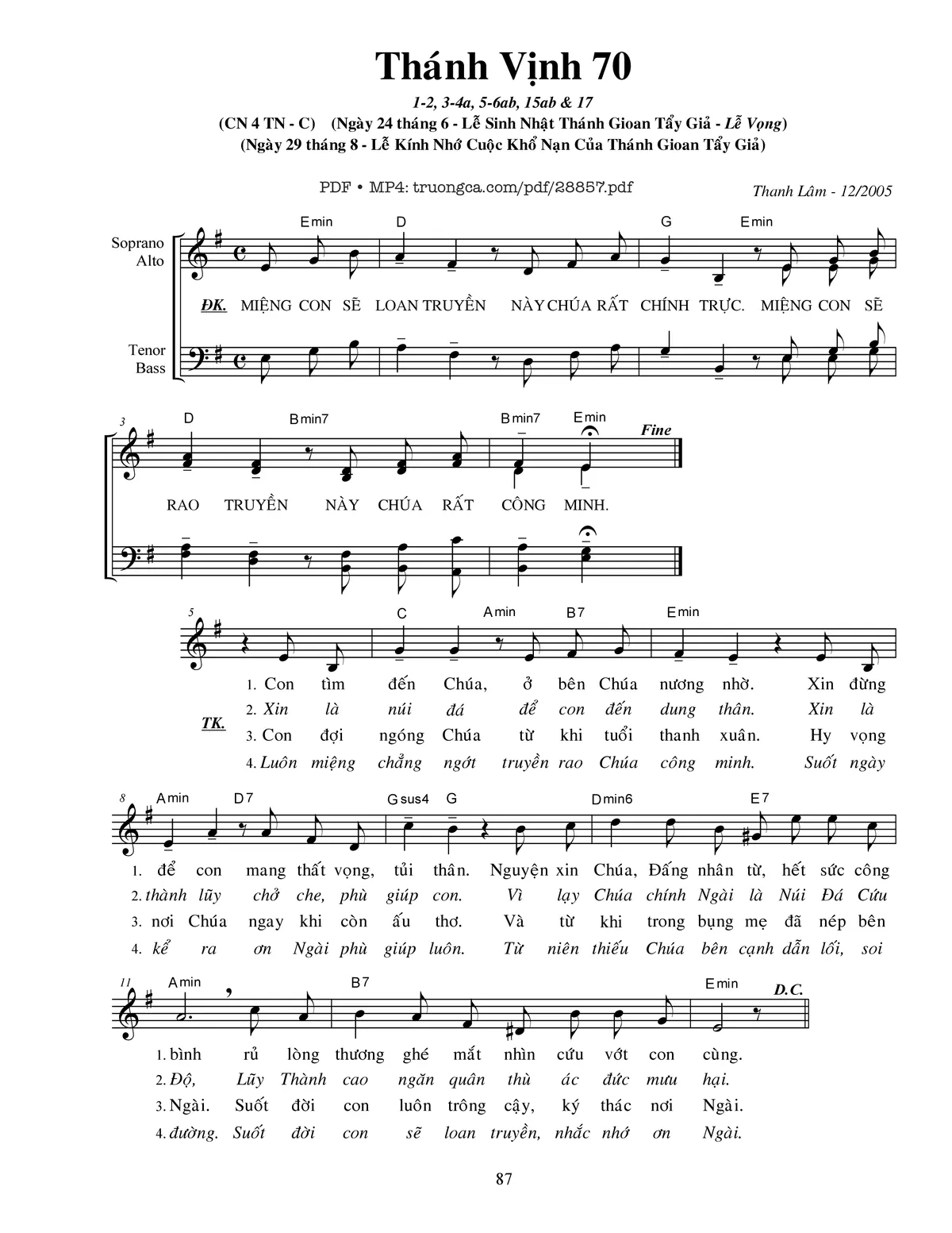 Thanh Lâm Miệng con sẽ loan truyền này Chúa rất chính trực [PDF] [Sheet] [Lời H.A] [Mp4/Midi]