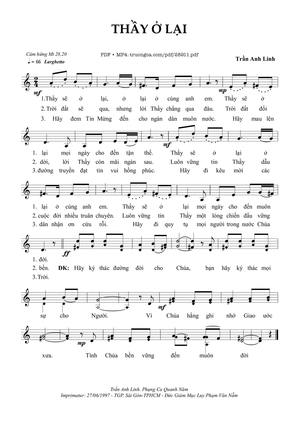 Câu đầu: Thầy sẽ ở lại ở lại ở cùng anh em Thầy sẽ ở lại mọi ngày cho đến tận thế