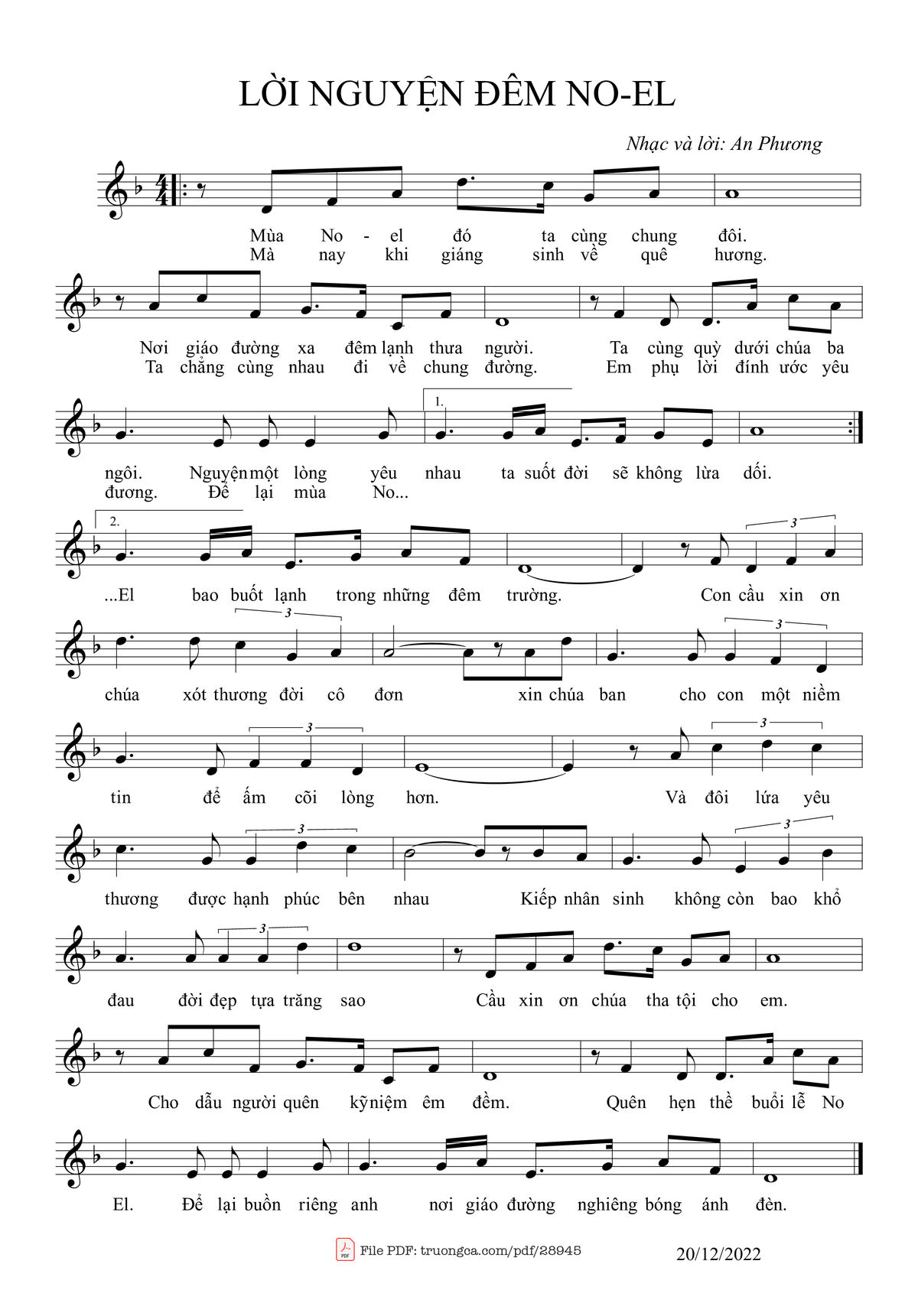 Phần nghe hát Lời nguyện đêm Noel (An Phương) được nhúng từ Youtube, Musescore hoặc link ngoài và chịu sự kiểm soát bản quyền của bên thứ ba đó, vì vậy có thể bị xóa hoặc chèn quảng cáo bất kỳ lúc nào. Nếu bạn không nghe - xem được ca sĩ hát tức là đã bị Youtube hoặc Musescore kiểm soát.