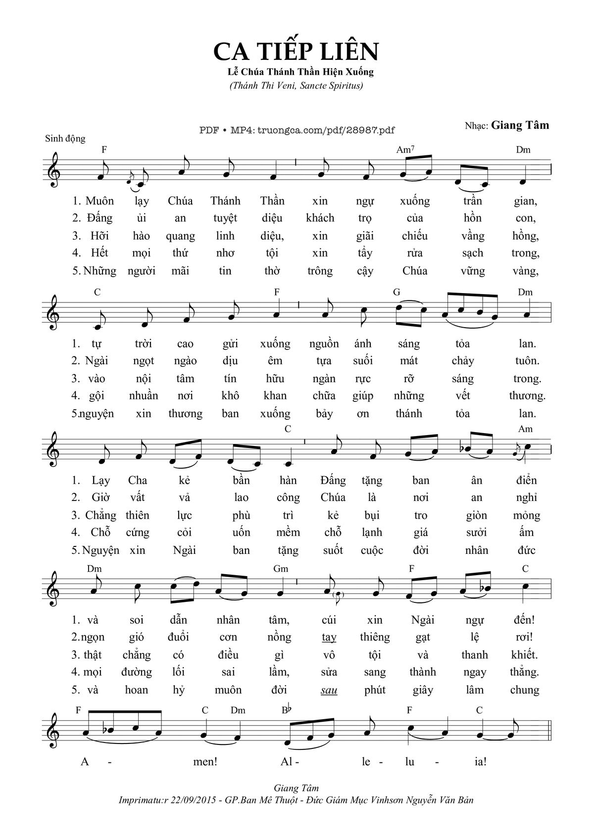 Giang Tâm Muôn lạy Chúa Thánh Thần xin ngự xuống trần gian tự trời cao gửi xuống nguồn ánh sáng toả lan [PDF] [Sheet] [Lời H.A] [Mp4/Midi]