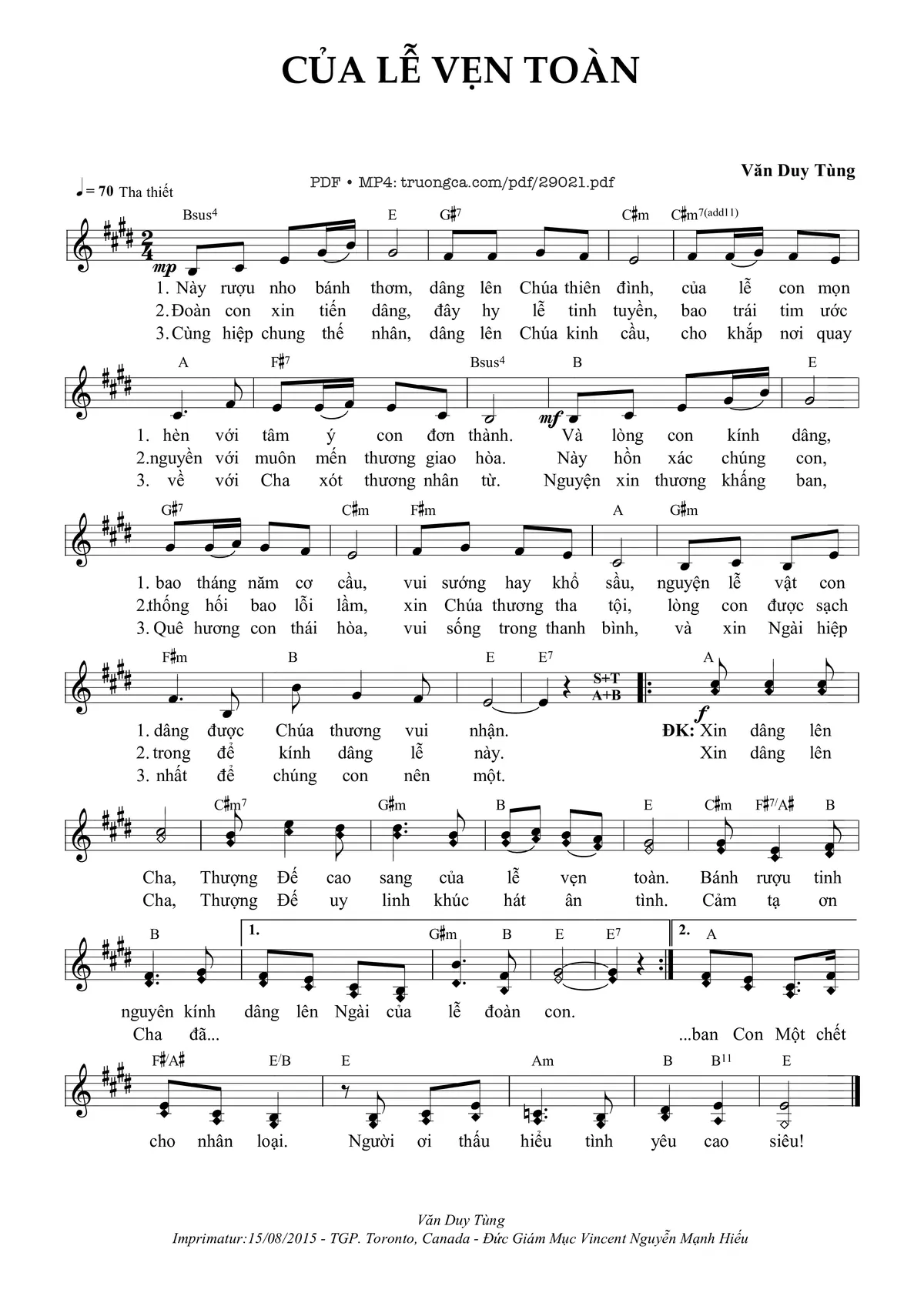 🌾 Imprimatur, Thông tin chuẩn nhận dùng trong phụng vụ Công Giáo: Dâng Lễ – Imprimatur – Tgp. Toronto: 15.08.2015
