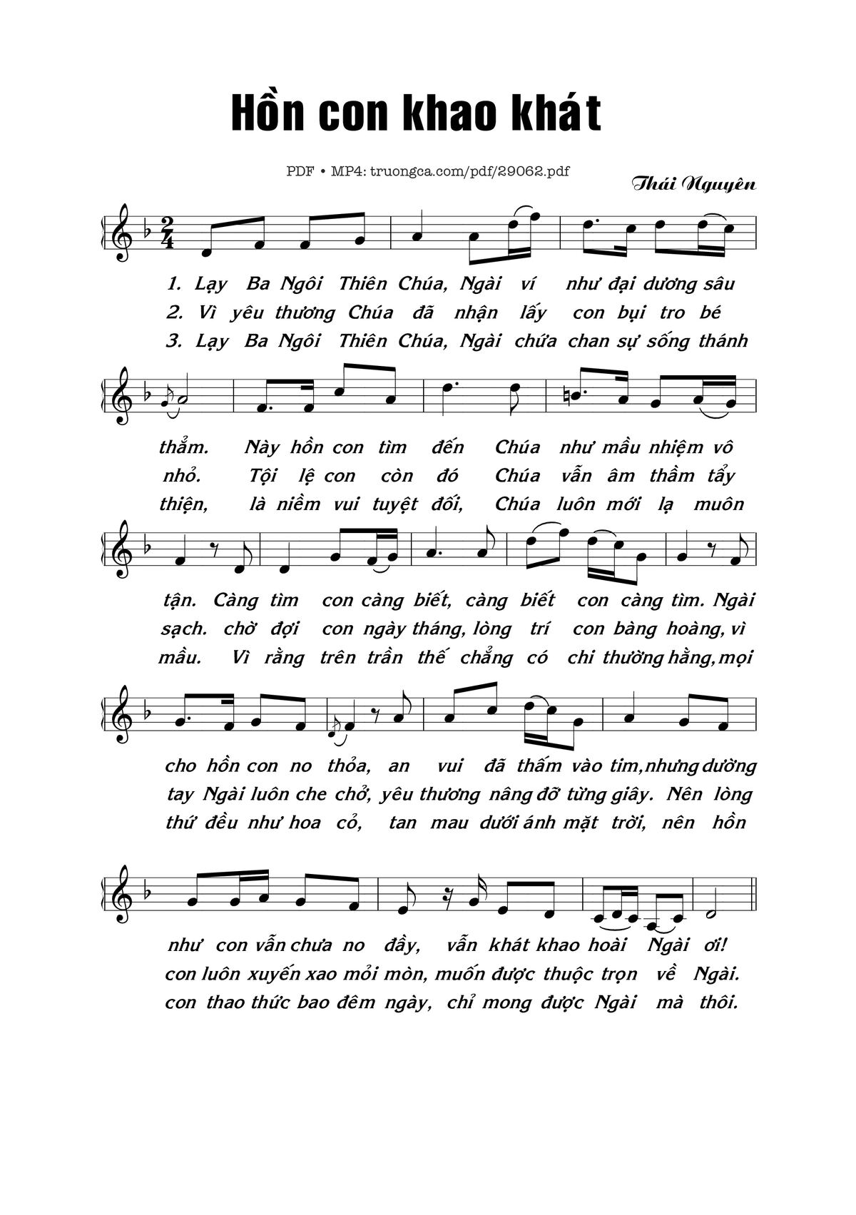 Điệp khúc. Con khao khát, con khao khát được thấy Chúa chính là sự sống, là ánh sáng tràn đầy vinh quang chói chan. Vì được dựng nên cho Ngài, nên lòng con mãi khát khao, vẫn thao thức hoài để được chính Ngài Thiên Chúa của con. Con tôn vinh NgàiBa Ngôi Thiên Chúa, Đấng dựng nên con, công trình của Ngài Đấng cứu chuộc con.
