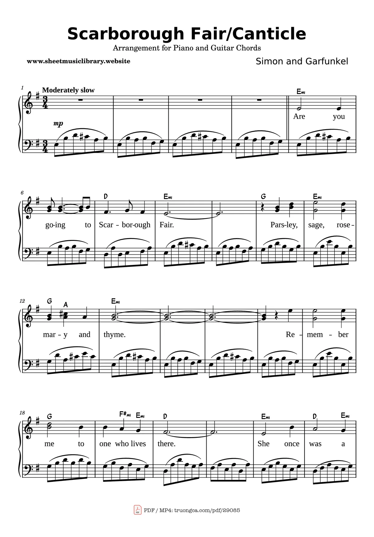 Phần đàn mẫu Scarborough Fair/Canticle Piano (Simon and Garfunkel) được nhúng từ Youtube, Musescore hoặc link ngoài và chịu sự kiểm soát bản quyền của bên thứ ba đó, vì vậy có thể bị xóa hoặc chèn quảng cáo bất kỳ lúc nào. Nếu bạn không nghe - xem được phần đàn mẫu hát mẫu tức là đã bị Youtube/Musescore kiểm soát.