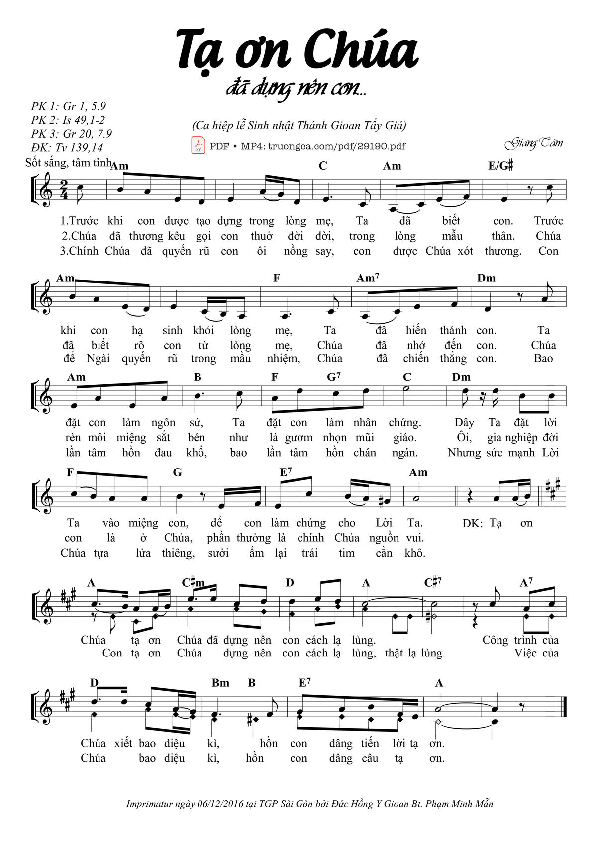 Điệp khúc. Tạ ơn Chúa, tạ ơn Chúa đã dựng nên con cách lạ lùng. Công trình của Chúa xiết bao diệu kì, hồn con dâng tiến lời tạ ơn.
