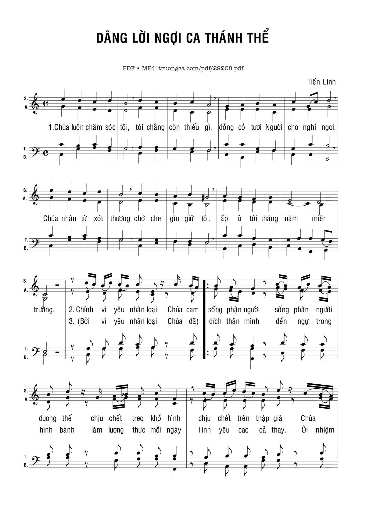 1) Chúa luôn chăm sóc tôi, tôi chẳng còn thiếu gì, đồng cỏ tươi Người cho nghỉ ngơi. Chúa nhân từ xót thương chở che gìn giữ tôi, ấp ủ tôi tháng năm miên trường.