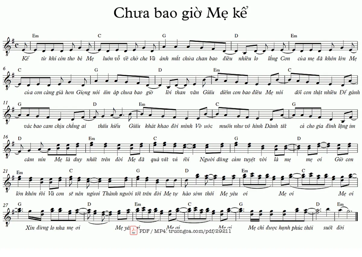 Câu đầu: Kể từ khi còn thơ bé Mẹ luôn vỗ về chở che