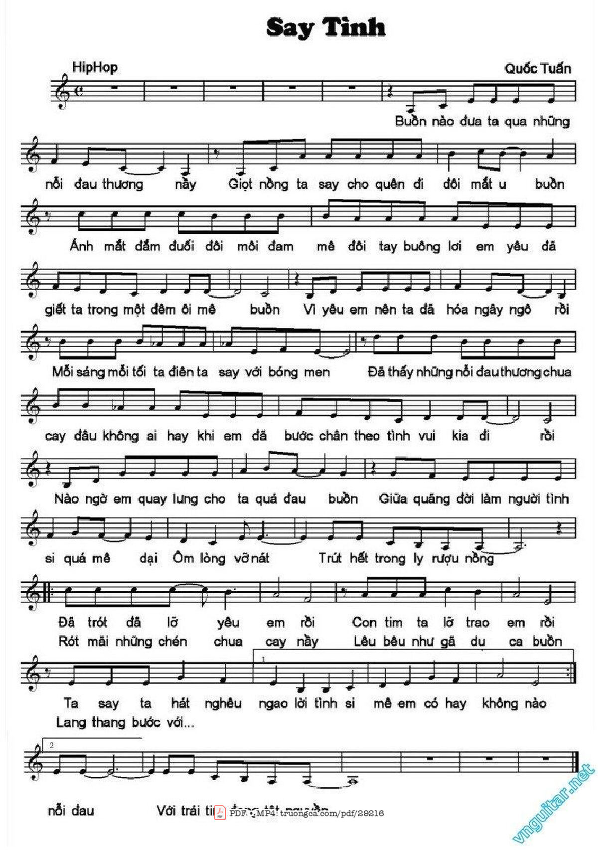 Sheet nhạc có nốt Say Tình của nhạc sĩ Quốc Tuấn và file PDF nốt nhạc đăng lên đây nhằm giúp các bạn xướng âm cho đúng nốt và hát thêm hay, chỉ mang tính chất tham khảo, không có mục đích thương mại. Bản quyền thuộc về tác giả và tổ chức nắm bản quyền, Truongca.com không giữ bất kỳ bản quyền của nội dung nào cả. Các bạn có thể tải về bản PDF chất lượng cao, gồm khuông nhạc có nốt với đường link file PDF bên trên.