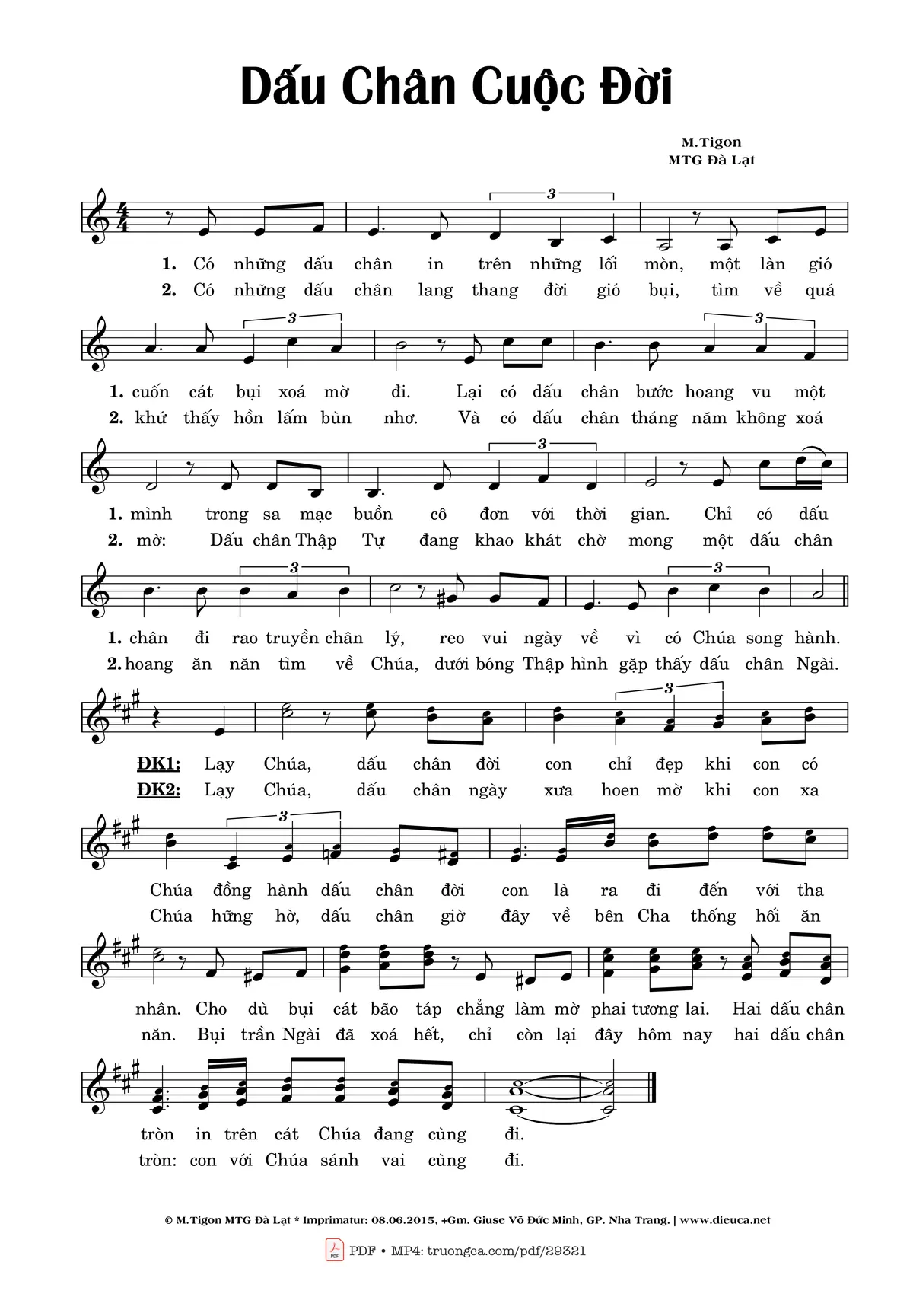 Điệp khúc1: Lạy Chúa, dấu chân đời con chỉ đẹp khi con có Chúa đồng hành dấu chân đời con là ra đi đến với tha nhân. Cho dù bụi cát bão táp chẳng làm mờ phai tương lai. Hai dấu chân tròn in trên cát Chúa đang cùng đi.