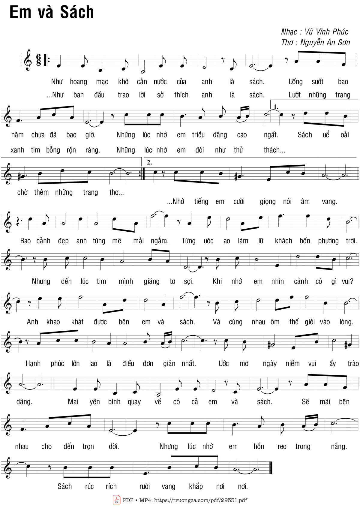 Phần nghe hát Em & sách (Vũ Vĩnh Phúc) được nhúng từ Youtube, Musescore hoặc link ngoài và chịu sự kiểm soát bản quyền của bên thứ ba đó, vì vậy có thể bị xóa hoặc chèn quảng cáo bất kỳ lúc nào. Nếu bạn không nghe - xem được ca sĩ hát tức là đã bị Youtube hoặc Musescore kiểm soát.