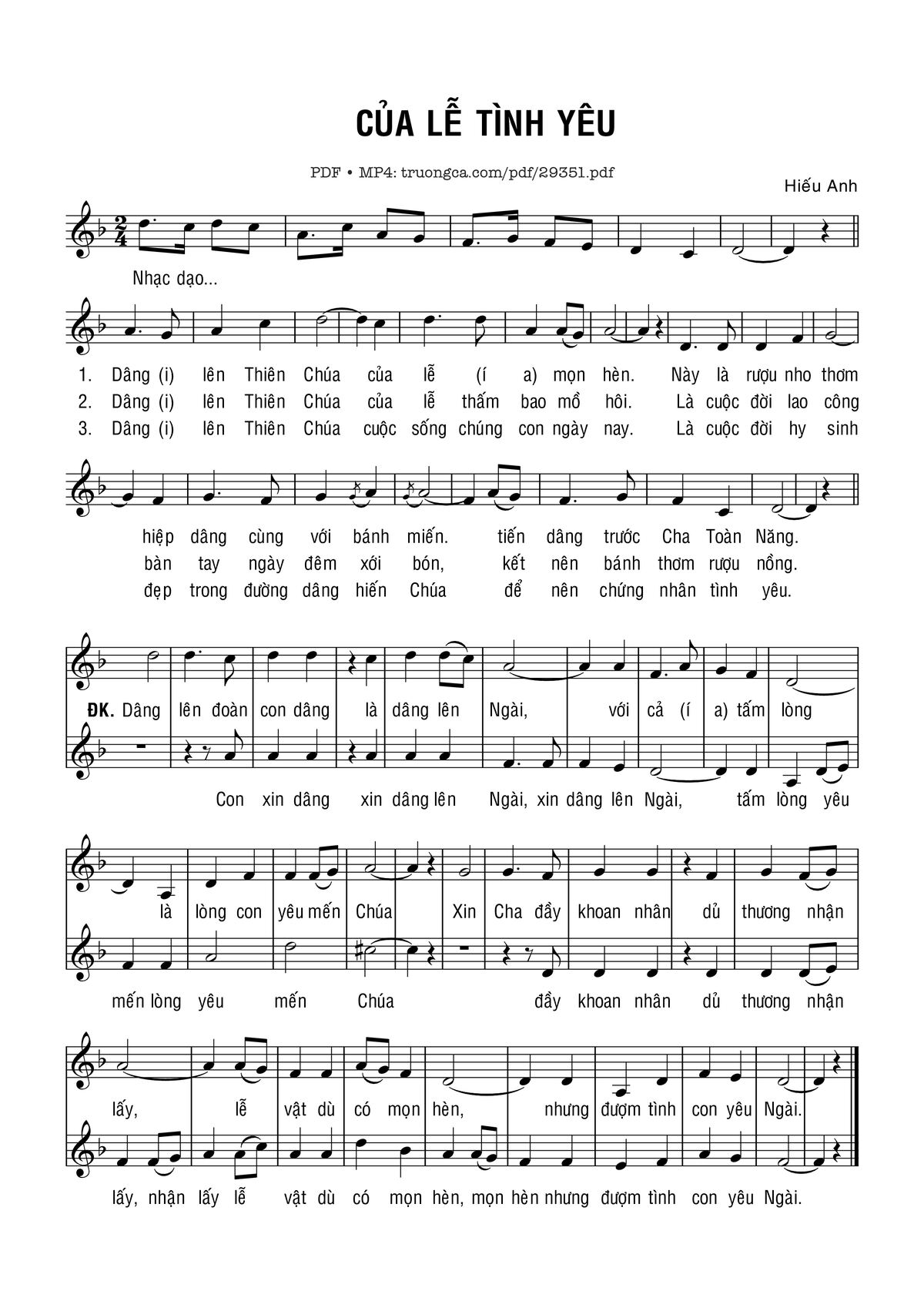 Hiếu Anh Dâng lên Thiên Chúa của lễ mọn hèn Này là rượu nho thơm hiệp dâng cùng với bánh miến [PDF] [Sheet] [Lời H.A] [Mp4/Midi]