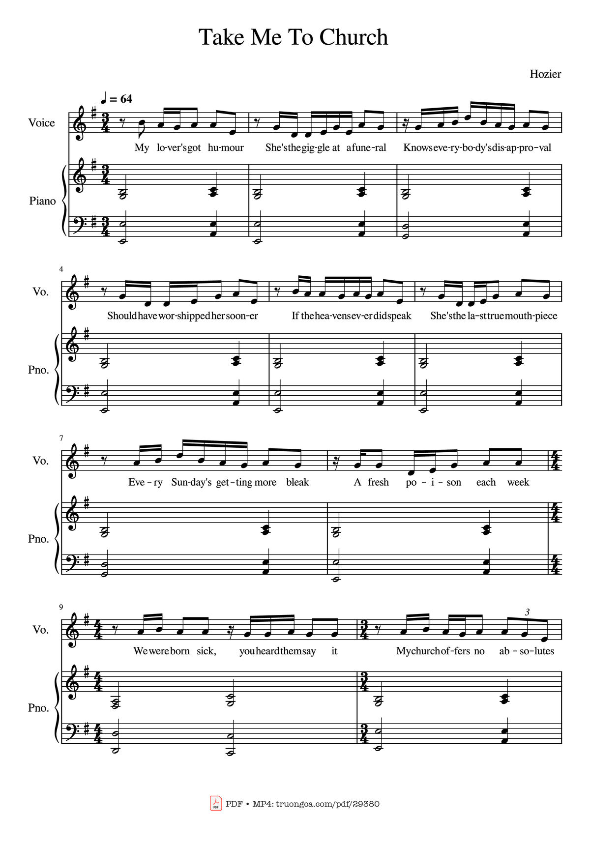 Download and print in PDF or MIDI free sheet music of take me to church - Hozier for Take Me To Church by Hozier arranged by scorpion_lily for Piano, Voice (other) (Piano-Voice)