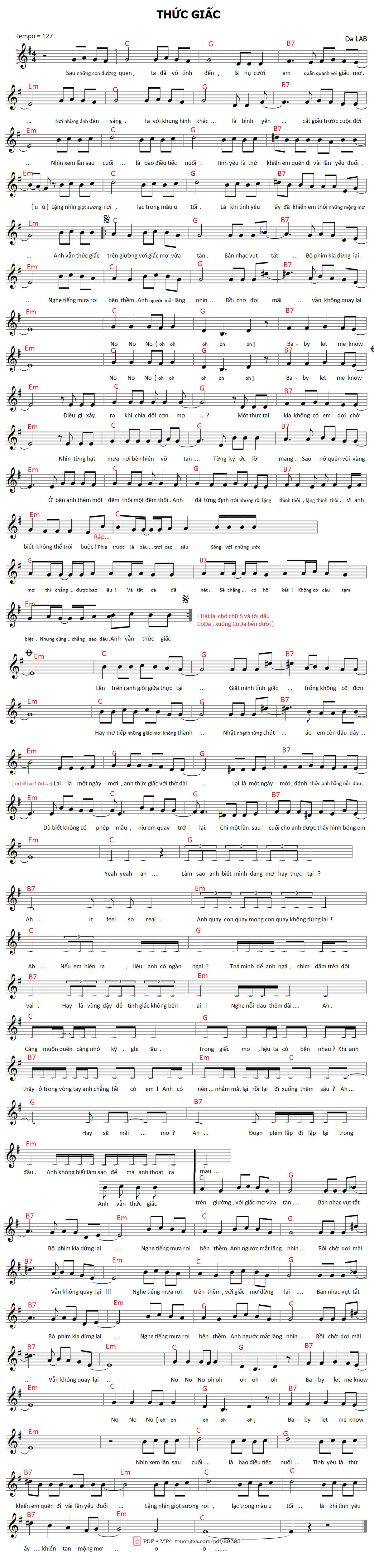 Phần nghe hát Thức giấc (Da Lab) được nhúng từ Youtube, Musescore hoặc link ngoài và chịu sự kiểm soát bản quyền của bên thứ ba đó, vì vậy có thể bị xóa hoặc chèn quảng cáo bất kỳ lúc nào. Nếu bạn không nghe - xem được ca sĩ hát tức là đã bị Youtube hoặc Musescore kiểm soát.