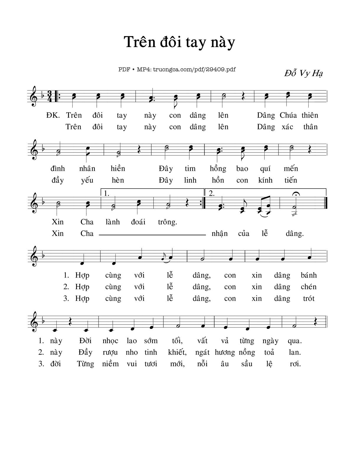 Câu đầu: Trên đôi tay này con dâng lên, dâng Chúa thiên đình nhân hiền.