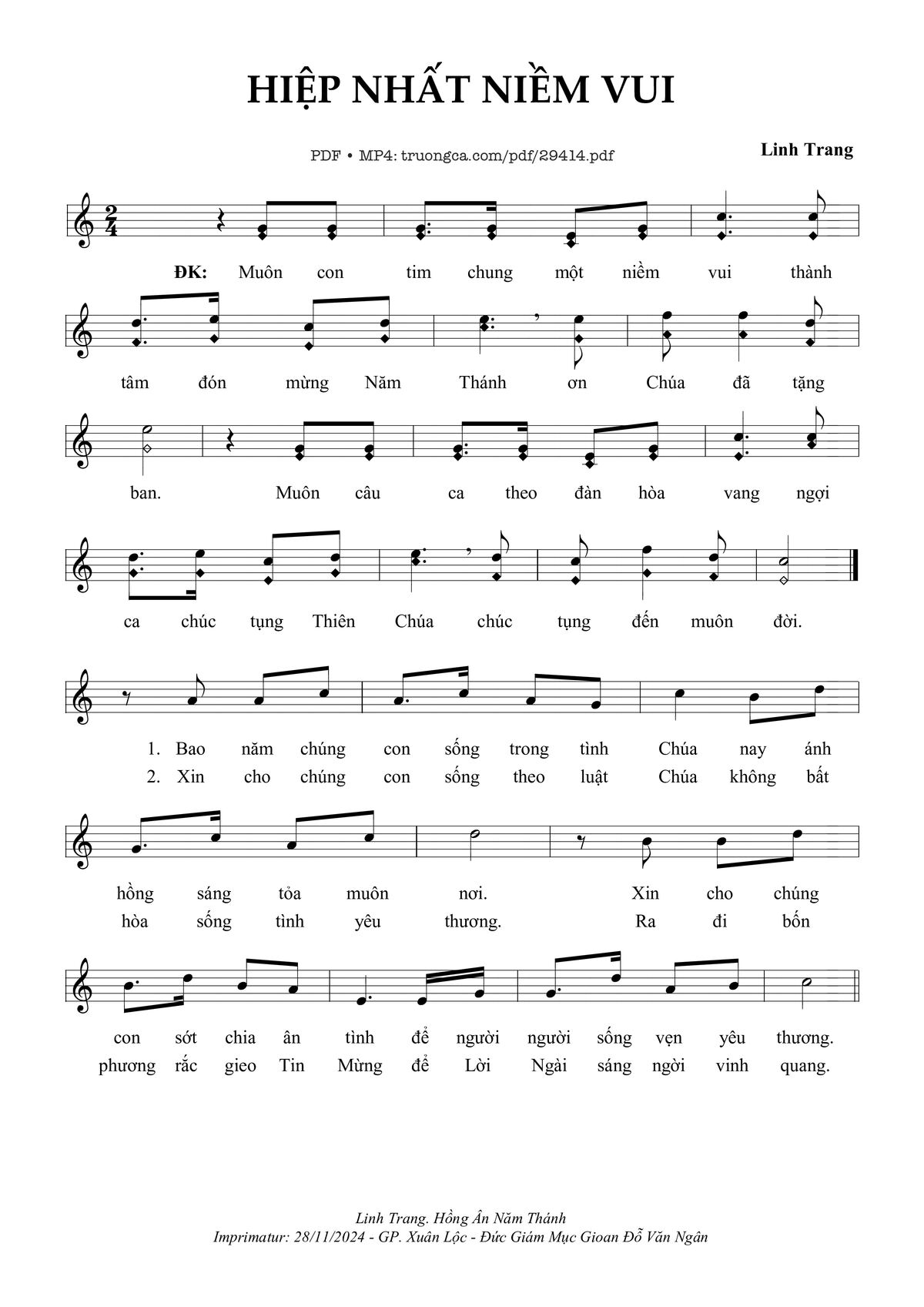 Linh Trang Muôn con tim chung một niềm vui thành tâm đón mừng Năm Thánh ơn Chúa đã tặng ban [PDF] [Sheet] [Lời H.A] [Mp4/Midi]