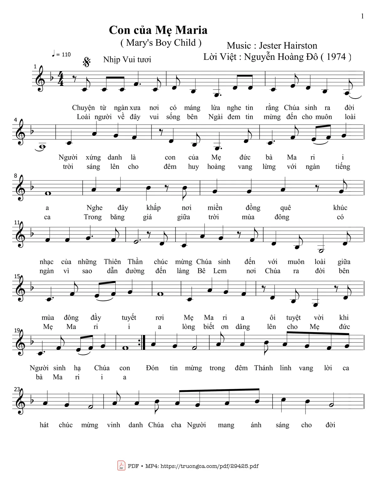Phần nghe hát Con của Mẹ Maria (Mary's Boy Child) (Jester Hairston) được nhúng từ Youtube, Musescore hoặc link ngoài và chịu sự kiểm soát bản quyền của bên thứ ba đó, vì vậy có thể bị xóa hoặc chèn quảng cáo bất kỳ lúc nào. Nếu bạn không nghe - xem được ca sĩ hát tức là đã bị Youtube hoặc Musescore kiểm soát.