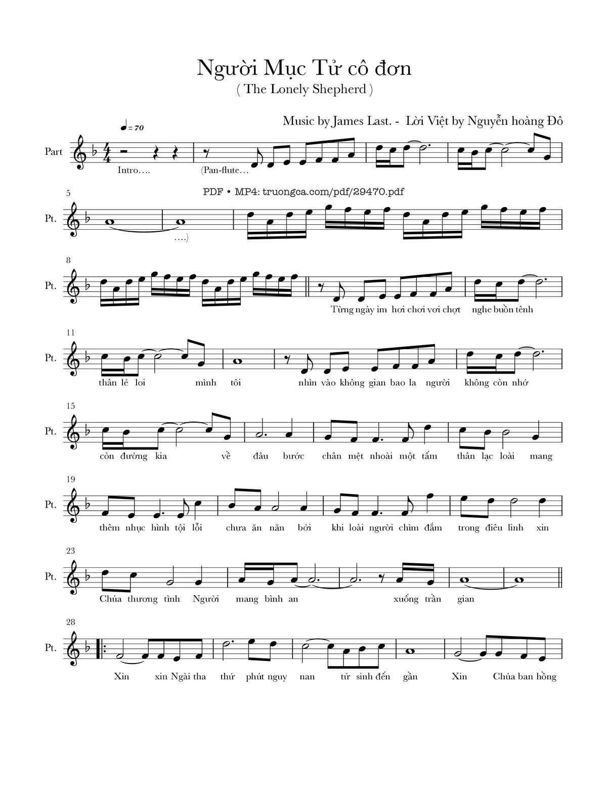 Phần nghe hát Người mục tử cô đơn (The Lonely Shepherd) (Nhạc Ngoại) được nhúng từ Youtube, Musescore hoặc link ngoài và chịu sự kiểm soát bản quyền của bên thứ ba đó, vì vậy có thể bị xóa hoặc chèn quảng cáo bất kỳ lúc nào. Nếu bạn không nghe - xem được ca sĩ hát tức là đã bị Youtube hoặc Musescore kiểm soát.