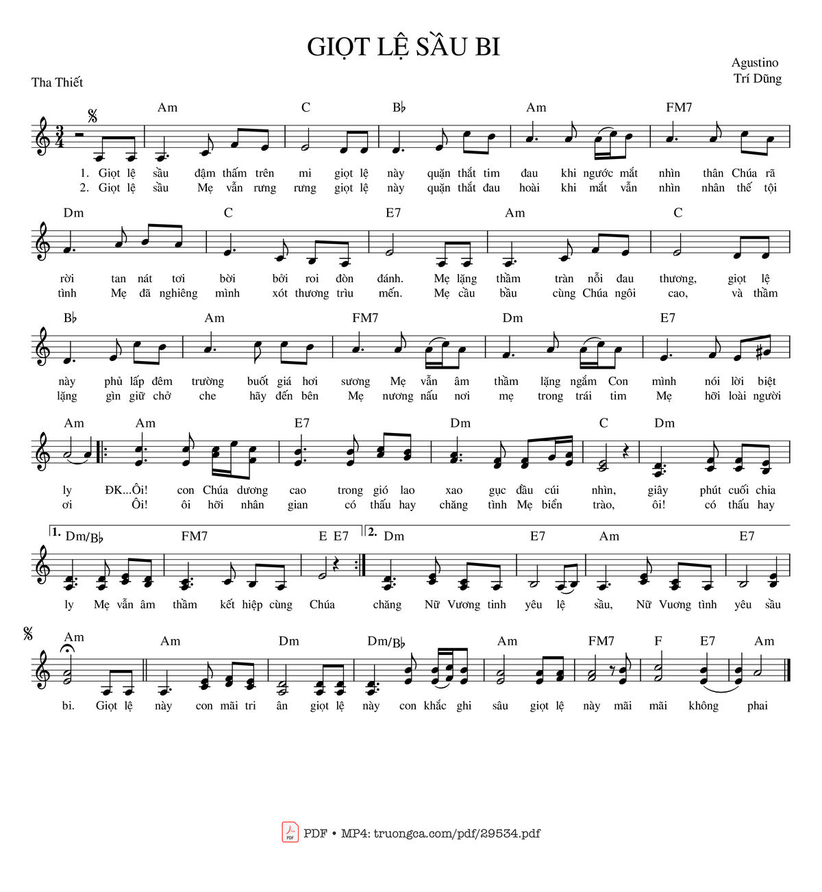 Sheet nhạc có nốt Giọt lệ sầu bi của nhạc sĩ Agustino Trí Dũng và file PDF nốt nhạc đăng lên đây nhằm giúp các bạn xướng âm cho đúng nốt và hát thêm hay, chỉ mang tính chất tham khảo, không có mục đích thương mại. Bản quyền thuộc về tác giả và tổ chức nắm bản quyền, Truongca.com không giữ bất kỳ bản quyền của nội dung nào cả. Các bạn có thể tải về bản PDF chất lượng cao, gồm khuông nhạc có nốt với đường link file PDF bên trên.