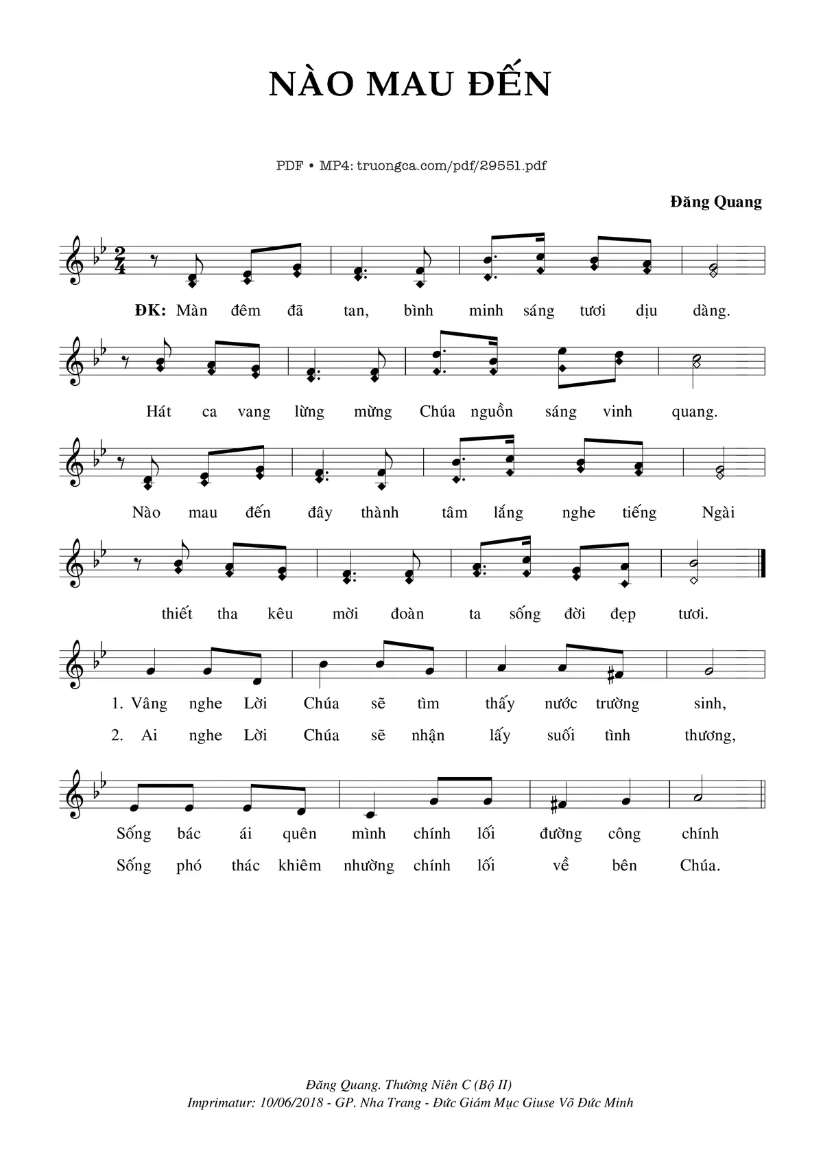Điệp khúc. Màn đêm đã tan, bình minh sáng tươi dịu dàng. Hát ca vang lừng mừng Chúa nguồn sáng vinh quang. Nào mau đến đây thành tâm lắng nghe tiếng Ngài thiết tha kêu mời đoàn ta sống đời đẹp tươi.
