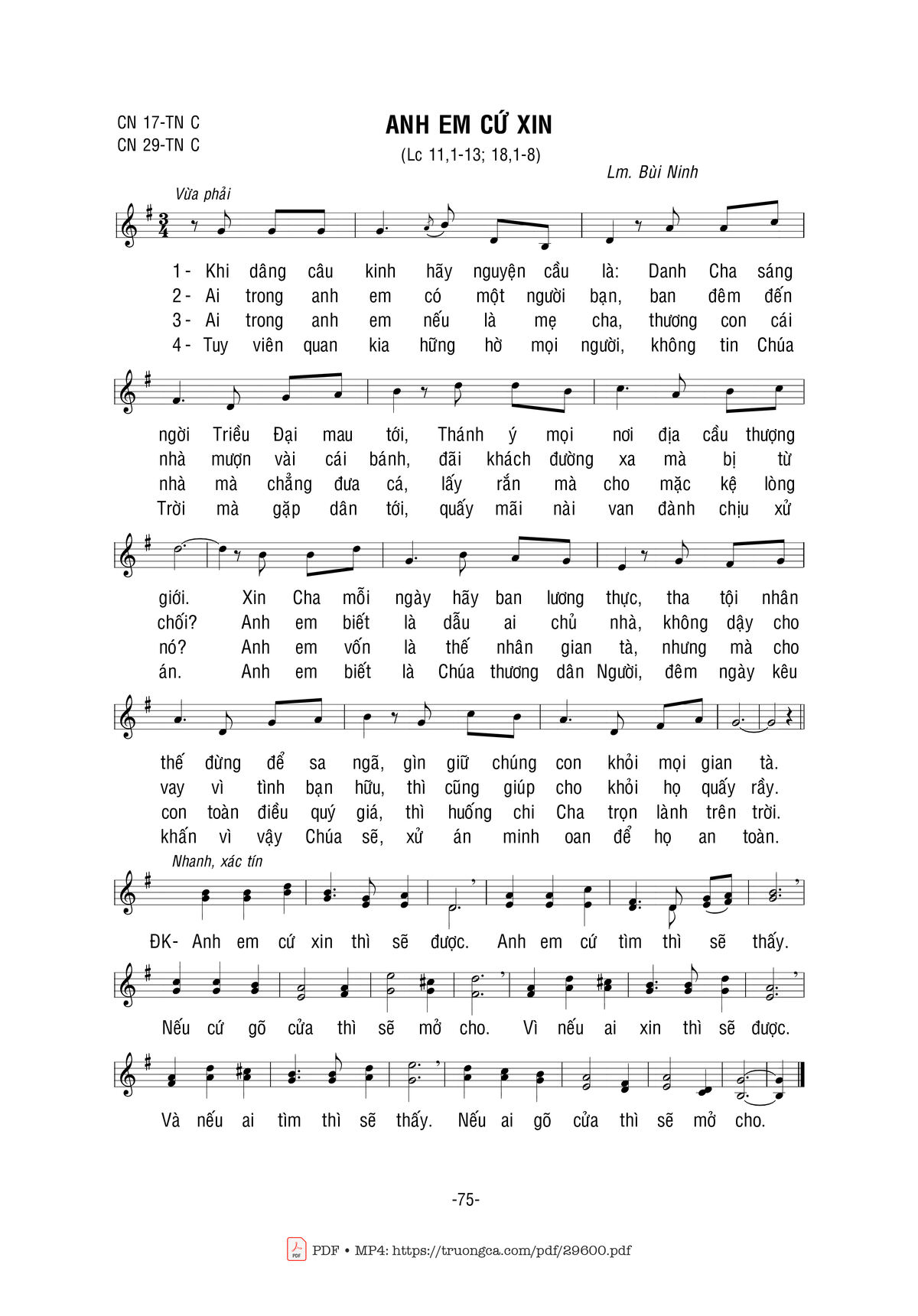 Điệp khúc. Anh em cứ xin thì sẽ được. Anh em cứ tìm thì sẽ thấy. Nếu cứ gõ cửa thì sẽ mở cho. Vì nếu ai xin thì sẽ được. Và nếu ai tìm thì sẽ thấy. Nếu ai gõ cửa thì sẽ mở cho.
