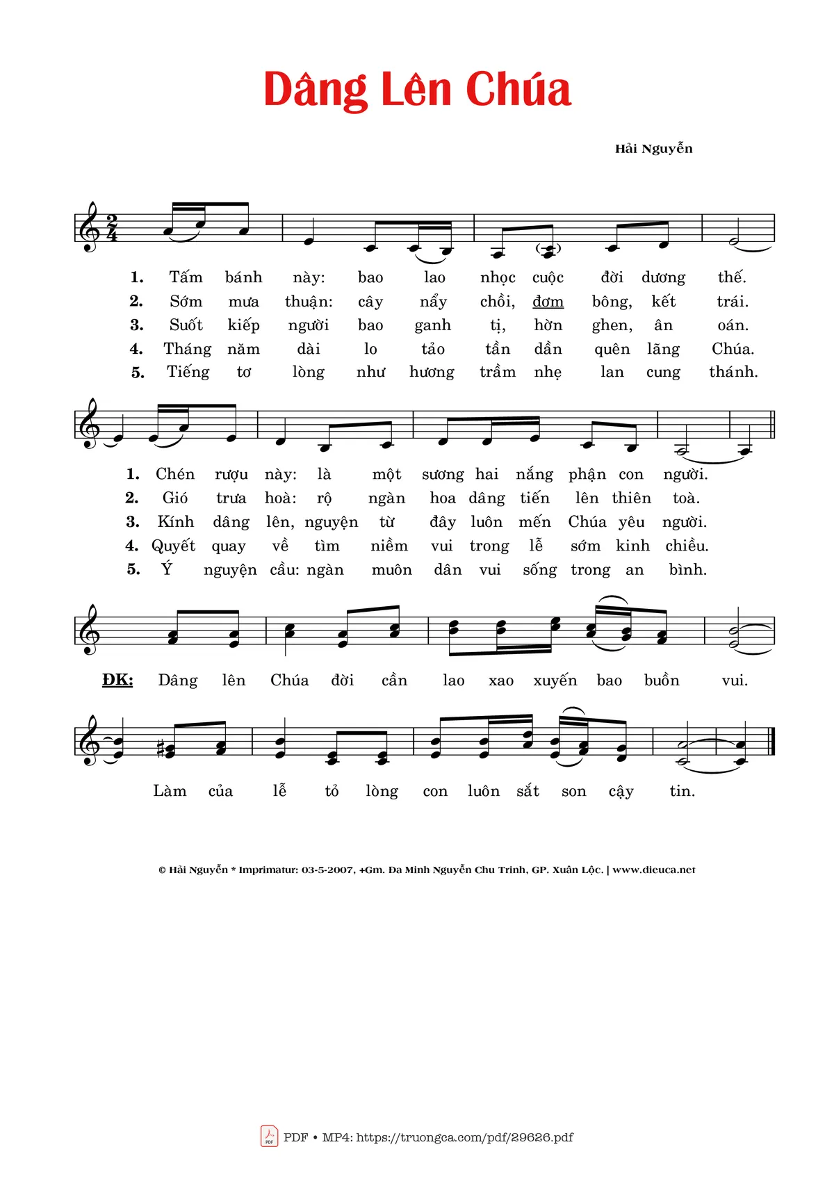 Điệp khúc: Dâng lên Chúa đời cần lao xao xuyến bao buồn vui. Làm của lễ tỏ lòng con luôn sắt son cậy tin.