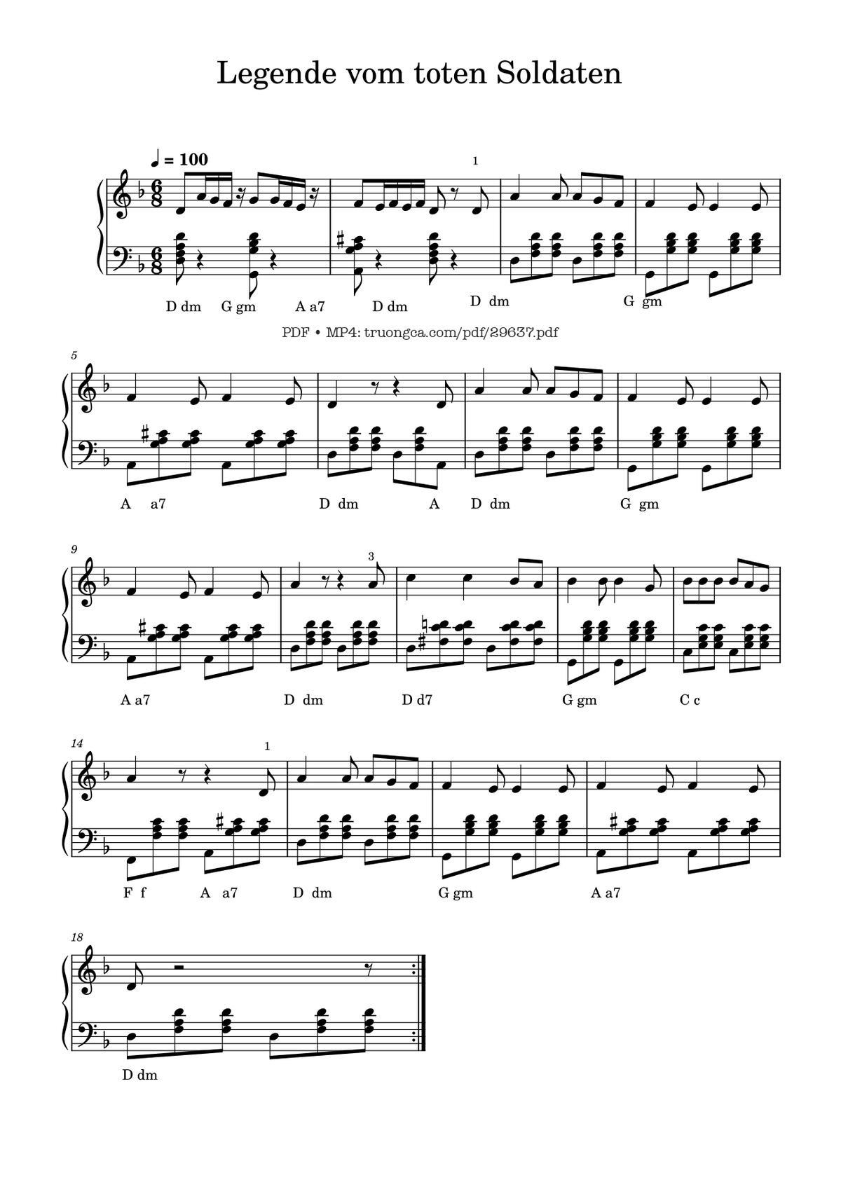 Chọn nút dấu + để tăng tông lên nửa cung, nút dấu - để giảm tông xuống nửa cung. Rê chuột vào hợp âm để xem các thế bấm hợp âm của bài hát Legende vom toten Soldaten.