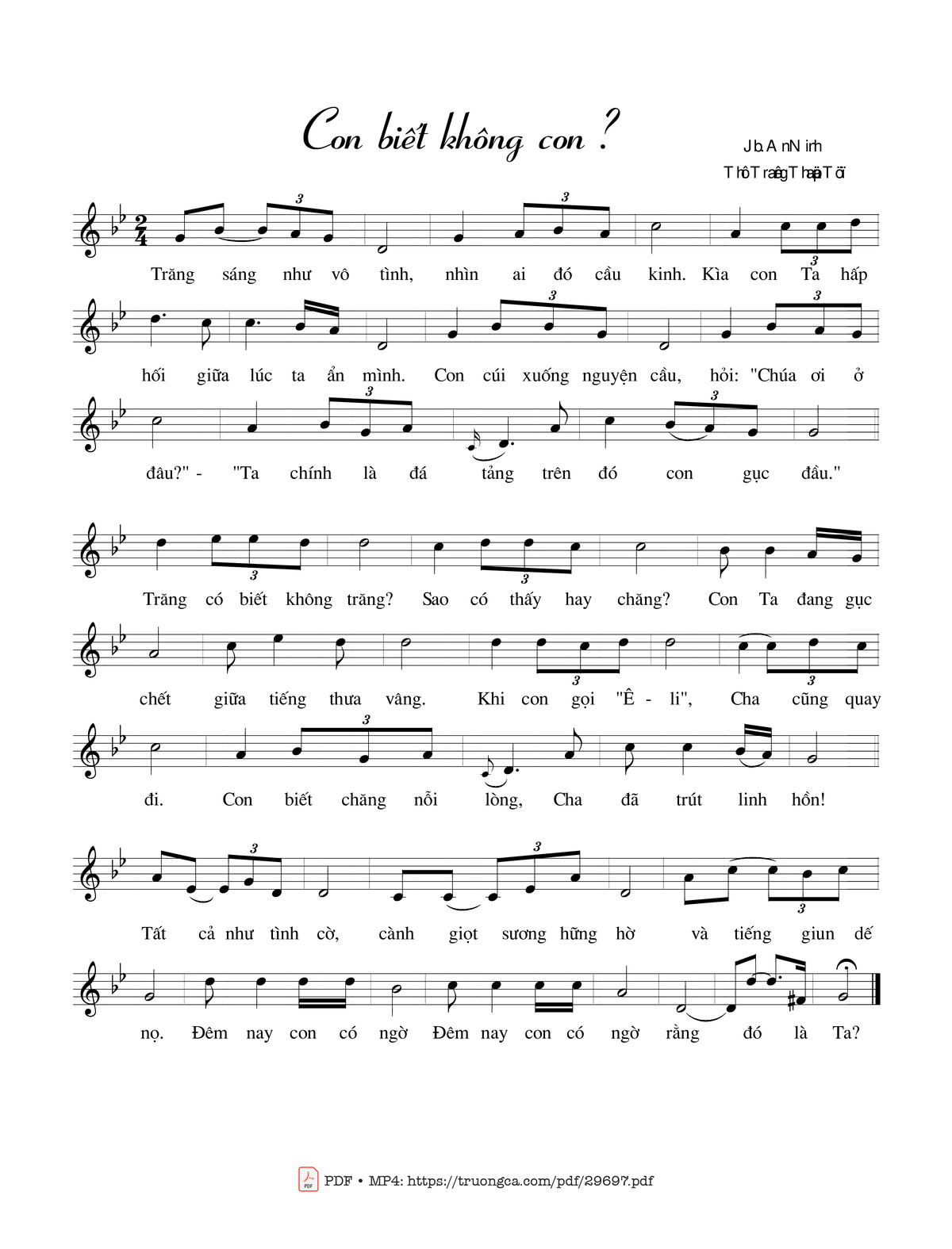 Sheet nhạc có nốt Con biết không con ? của nhạc sĩ Jb. An Ninh và file PDF nốt nhạc đăng lên đây nhằm giúp các bạn xướng âm cho đúng nốt và hát thêm hay, chỉ mang tính chất tham khảo, không có mục đích thương mại. Bản quyền thuộc về tác giả và tổ chức nắm bản quyền, Truongca.com không giữ bất kỳ bản quyền của nội dung nào cả. Các bạn có thể tải về bản PDF chất lượng cao, gồm khuông nhạc có nốt với đường link file PDF bên trên.
