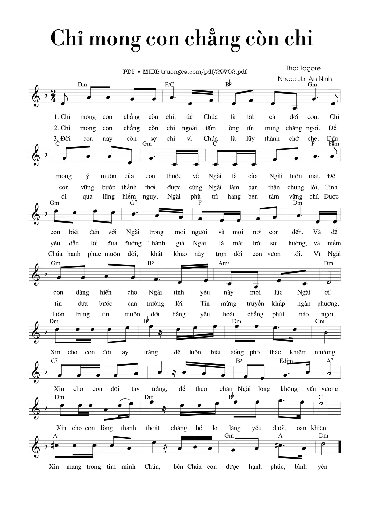 Sheet nhạc có nốt Chỉ mong con chẳng còn chi của nhạc sĩ Jb. An Ninh và file PDF nốt nhạc đăng lên đây nhằm giúp các bạn xướng âm cho đúng nốt và hát thêm hay, chỉ mang tính chất tham khảo, không có mục đích thương mại. Bản quyền thuộc về tác giả và tổ chức nắm bản quyền, Truongca.com không giữ bất kỳ bản quyền của nội dung nào cả. Các bạn có thể tải về bản PDF chất lượng cao, gồm khuông nhạc có nốt với đường link file PDF bên trên.