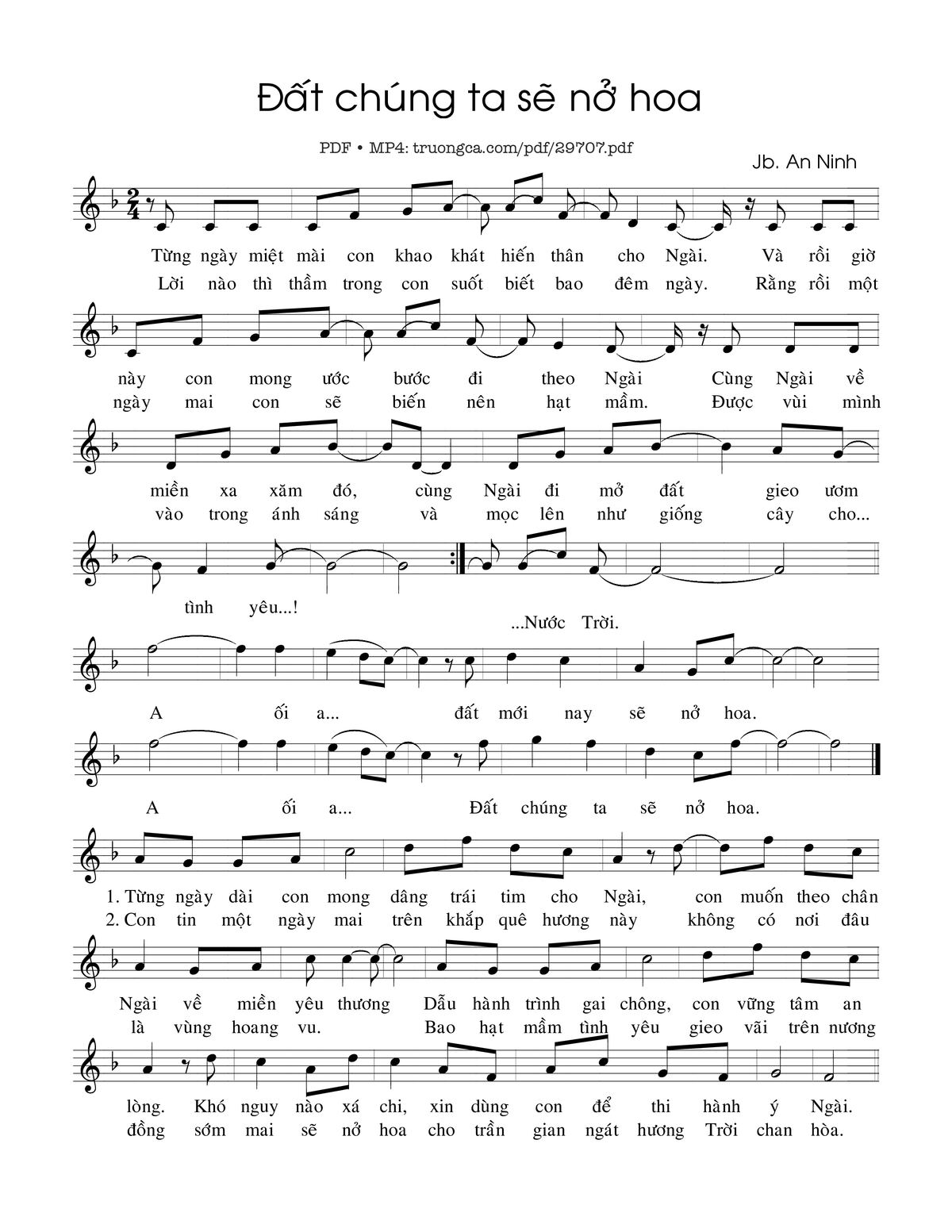 Sheet nhạc có nốt Đất chúng ta sẽ nở hoa của nhạc sĩ Jb. An Ninh và file PDF nốt nhạc đăng lên đây nhằm giúp các bạn xướng âm cho đúng nốt và hát thêm hay, chỉ mang tính chất tham khảo, không có mục đích thương mại. Bản quyền thuộc về tác giả và tổ chức nắm bản quyền, Truongca.com không giữ bất kỳ bản quyền của nội dung nào cả. Các bạn có thể tải về bản PDF chất lượng cao, gồm khuông nhạc có nốt với đường link file PDF bên trên.