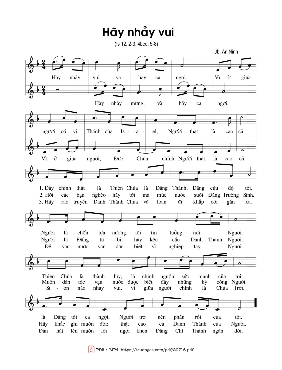 Sheet nhạc có nốt Hãy nhảy vui (Is. 12) của nhạc sĩ Jb. An Ninh và file PDF nốt nhạc đăng lên đây nhằm giúp các bạn xướng âm cho đúng nốt và hát thêm hay, chỉ mang tính chất tham khảo, không có mục đích thương mại. Bản quyền thuộc về tác giả và tổ chức nắm bản quyền, Truongca.com không giữ bất kỳ bản quyền của nội dung nào cả. Các bạn có thể tải về bản PDF chất lượng cao, gồm khuông nhạc có nốt với đường link file PDF bên trên.