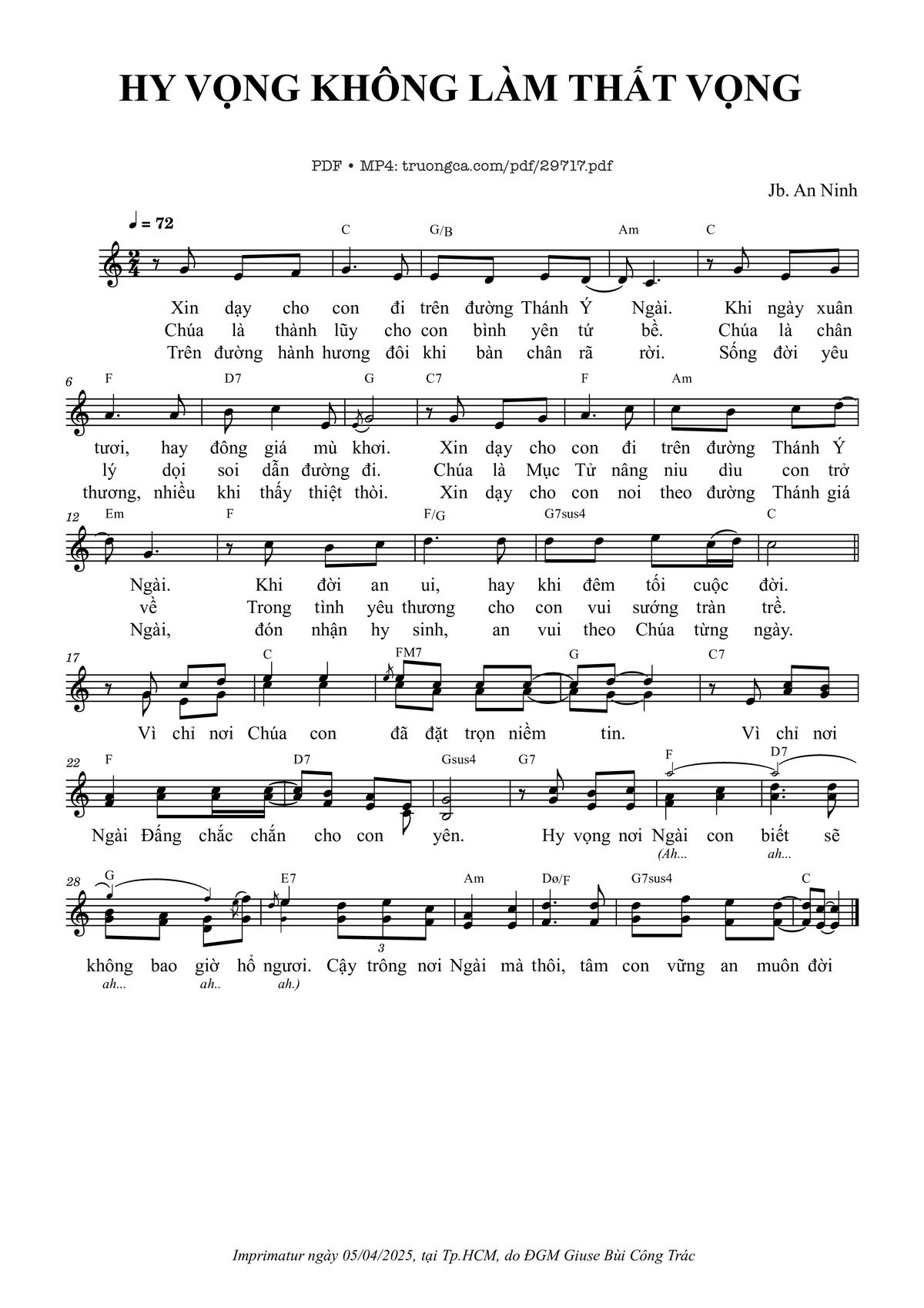Sheet nhạc có nốt Hy vọng không làm thất vọng của nhạc sĩ Jb. An Ninh và file PDF nốt nhạc đăng lên đây nhằm giúp các bạn xướng âm cho đúng nốt và hát thêm hay, chỉ mang tính chất tham khảo, không có mục đích thương mại. Bản quyền thuộc về tác giả và tổ chức nắm bản quyền, Truongca.com không giữ bất kỳ bản quyền của nội dung nào cả. Các bạn có thể tải về bản PDF chất lượng cao, gồm khuông nhạc có nốt với đường link file PDF bên trên.