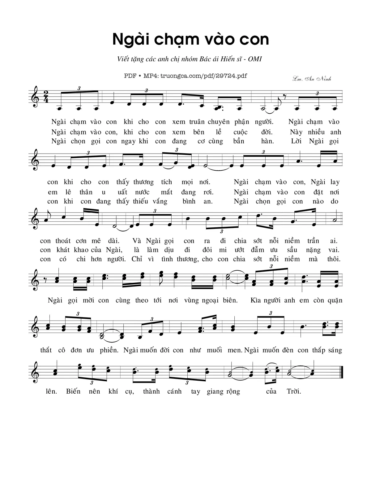 Sheet nhạc có nốt Ngài chạm vào con của nhạc sĩ Jb. An Ninh và file PDF nốt nhạc đăng lên đây nhằm giúp các bạn xướng âm cho đúng nốt và hát thêm hay, chỉ mang tính chất tham khảo, không có mục đích thương mại. Bản quyền thuộc về tác giả và tổ chức nắm bản quyền, Truongca.com không giữ bất kỳ bản quyền của nội dung nào cả. Các bạn có thể tải về bản PDF chất lượng cao, gồm khuông nhạc có nốt với đường link file PDF bên trên.