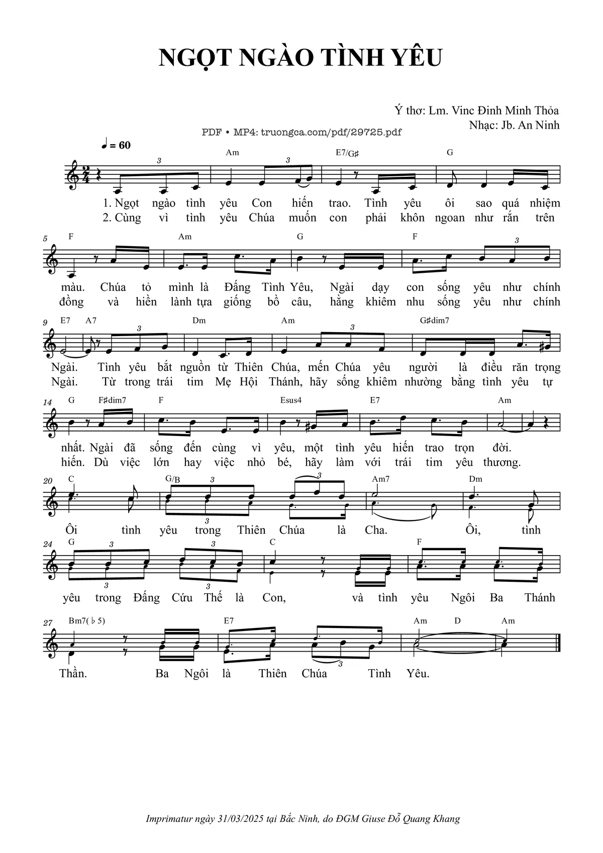 Sheet nhạc có nốt Ngọt ngào tình yêu của nhạc sĩ Jb. An Ninh và file PDF nốt nhạc đăng lên đây nhằm giúp các bạn xướng âm cho đúng nốt và hát thêm hay, chỉ mang tính chất tham khảo, không có mục đích thương mại. Bản quyền thuộc về tác giả và tổ chức nắm bản quyền, Truongca.com không giữ bất kỳ bản quyền của nội dung nào cả. Các bạn có thể tải về bản PDF chất lượng cao, gồm khuông nhạc có nốt với đường link file PDF bên trên.